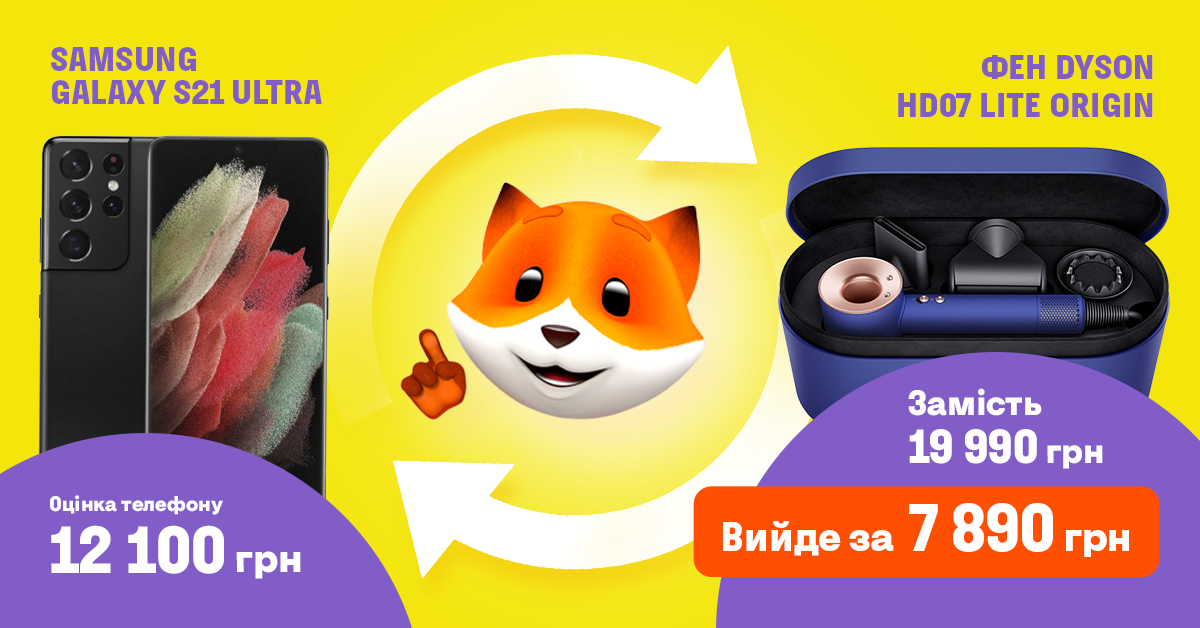 Наприклад, ви хочете обміняти свій Samsung Galaxy S21 Ultra на фен Dyson HD07 Lite Origin Black/Nickel. При обміні орієнтовна вартість вашого Galaxy S21 Ultra складе 11 000 грн, а додаткова вигода від Фокстрот становить 1100 грн. Загальна знижка буде 12 100 грн. Ціна фена Dyson становить 19 990 грн, тому вам потрібно буде доплатити лише 7890 грн.