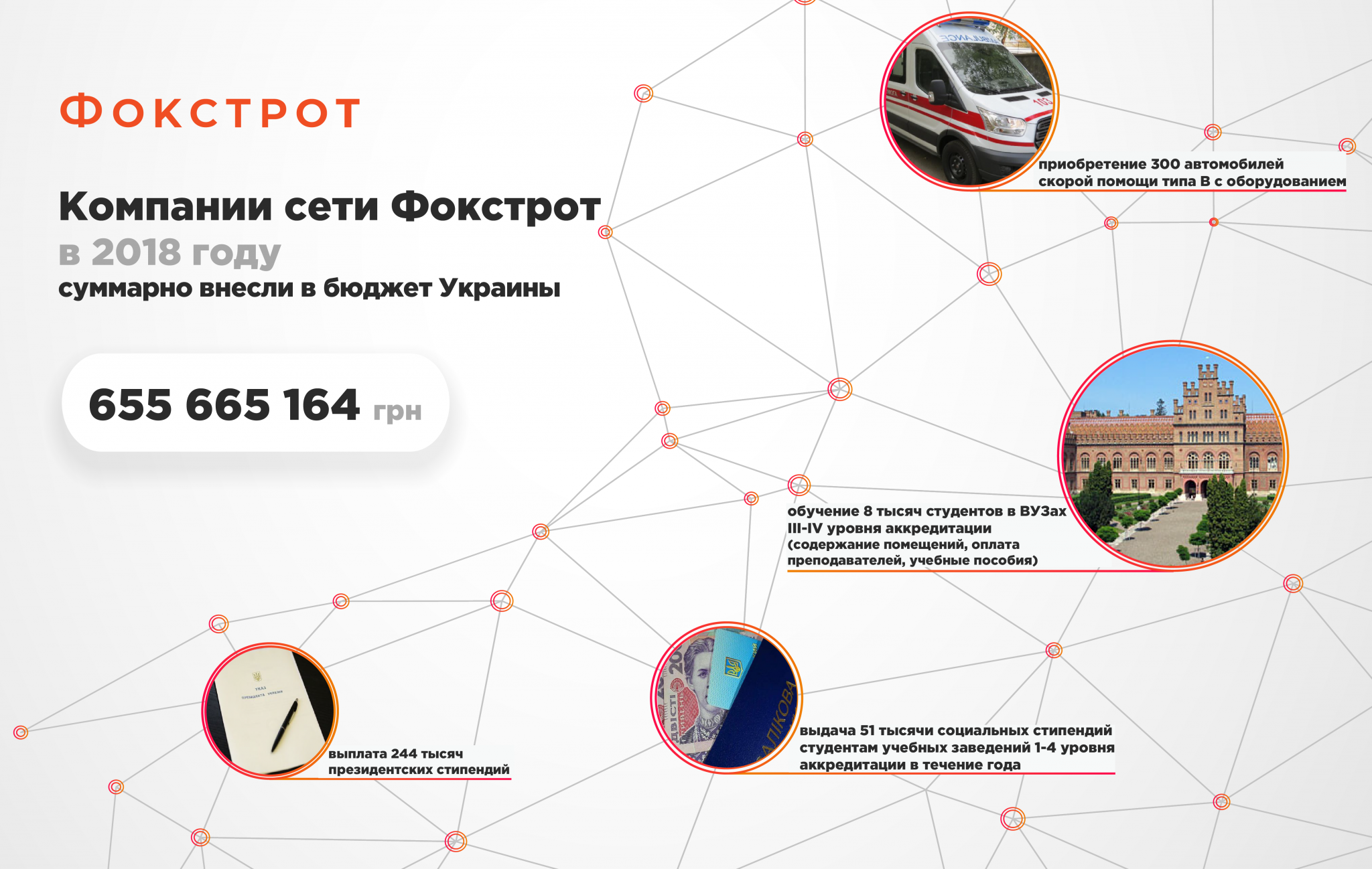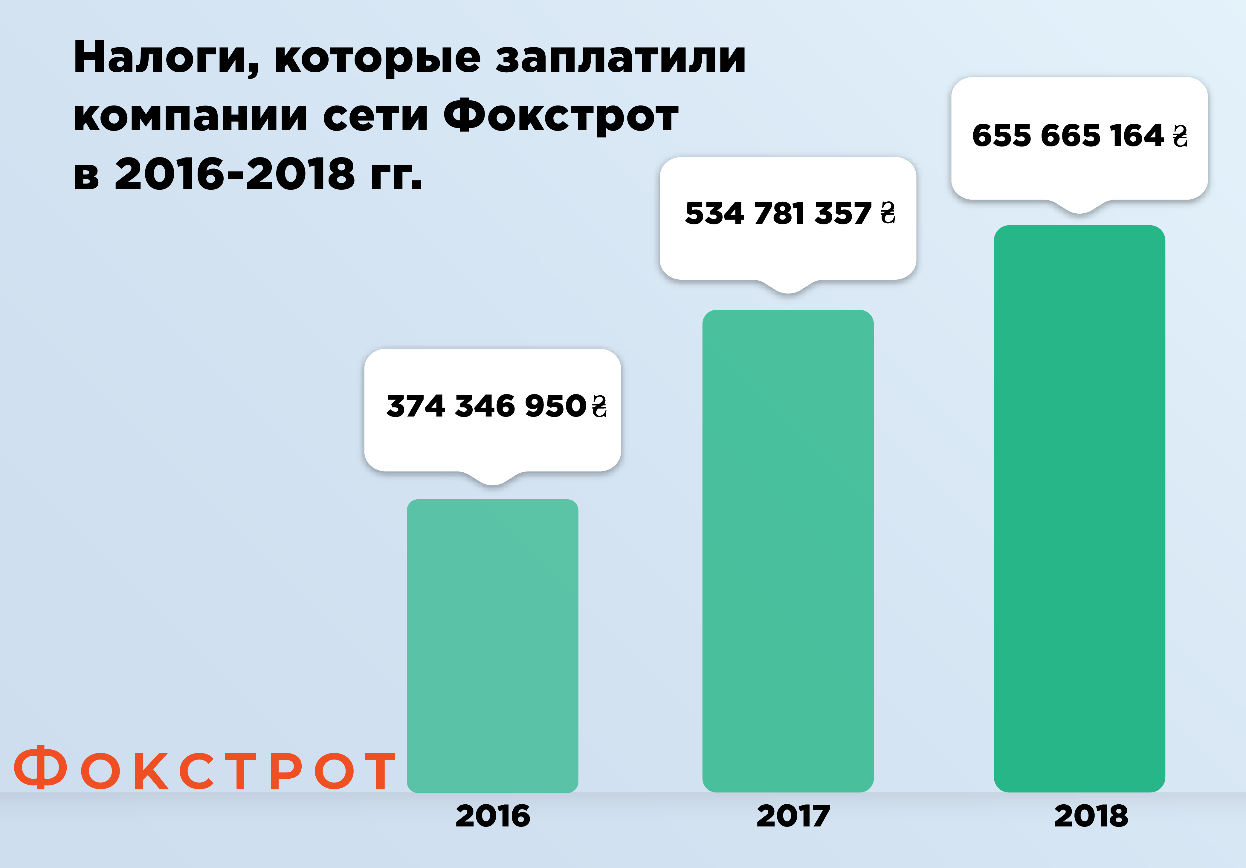 Як повідомила RAU прес-служба компанії, в цілому в 2018 році підприємства торгової мережі Фокстрот внесли до державного бюджету України 655,7 млн грн, тоді як роком раніше цей показник склав 534,8 млн грн. Таким чином, відрахування компанії до держбюджету в минулому році збільшилися на 22,6%.