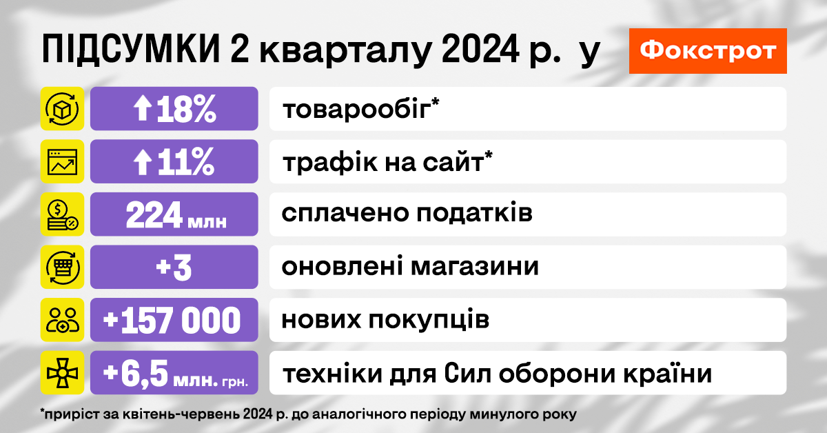 Так, за ІІ квартал 2024 року Фокстрот сплатив 224 млн грн податків, а загальна сума за перше півріччя перевищує 430 млн грн, що є 76% від повної минулорічної суми. У порівнянні до аналогічного періоду минулого року, товарообіг у квітні-червні 2024 зріс на 18%. Найбільший ріст показали категорії аксесуарів (+56%), смартфонів (+27%), комп’ютерної техніки (+33%), а також з числа непрофільних товарів (+237%), зокрема товарів для дітей. Трафік на сайт збільшився на 11%.