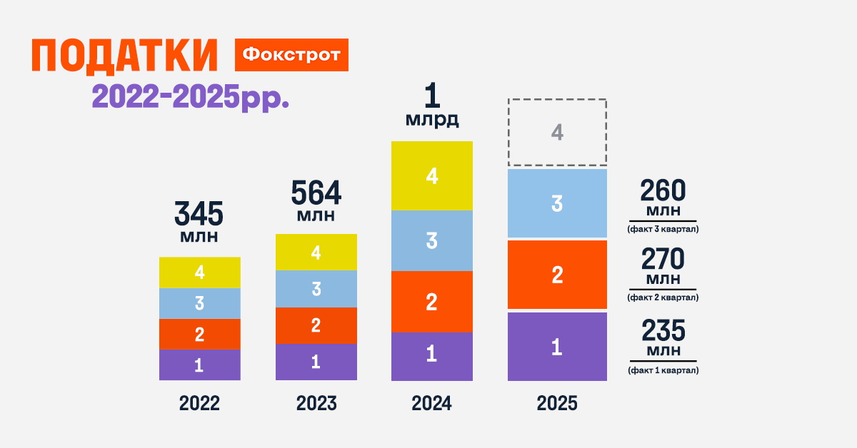 Зазначимо, ритейлер не лише входить до числа найбільших платників податків, а й активно підтримує державу через волонтерські ініціативи, допомогу захисникам та реалізацію ESG-проєктів. За час повномасштабної війни в Україні (починаючи з 24 лютого 2022 року), Фокстрот передав обладнання на 50,5 млн грн на потреби захисників. Це – понад 9000 одиниць техніки, яку отримали військові підрозділи Сил оборони України.