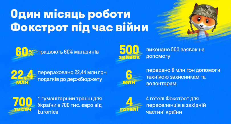 Фокстрот підбив результати роботи зі збереження бізнесу та допомоги Україні у перший місяць війни. За словами виконавчого директора Фокстрот Олексія Зозулі, компанія з перших днів війни поставила перед собою чотири задачі та створила штаб із їх реалізації.