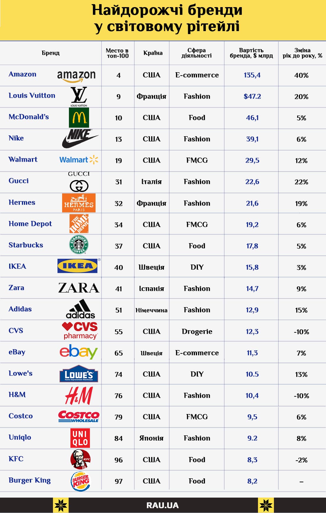 Американський журнал Forbes опублікував щорічний рейтинг найдорожчих брендів планети. До першої сотні увійшло 20 компаній сфери роздрібної торгівлі, e-commerce і ресторанного рітейлу.