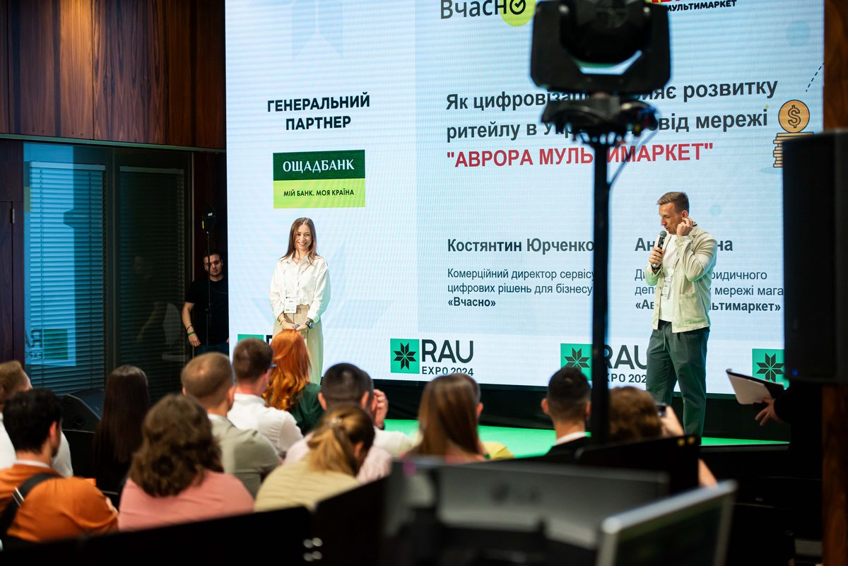 Керівниця юридичного департаменту Аврора Мультимаркет Анна Каніна та комерційний директор цифрових сервісів для бізнесу Вчасно Костянтин Юрченко показали на прикладі мережі Аврора, як цифровізація бізнес-процесів в ритейлі сприяє ефективності бізнесу.