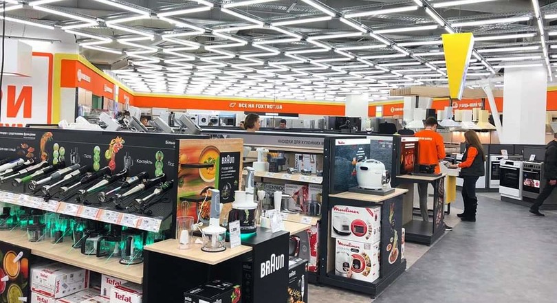 Фокстрот в ТРЦ Dream Town (Київ). Одна з найважливіших змін – збільшення площі торгового залу, яка становить понад 1000 кв. м. За рахунок цього змінено й оптимізовано зонування, яке полегшує вибір необхідного товару.