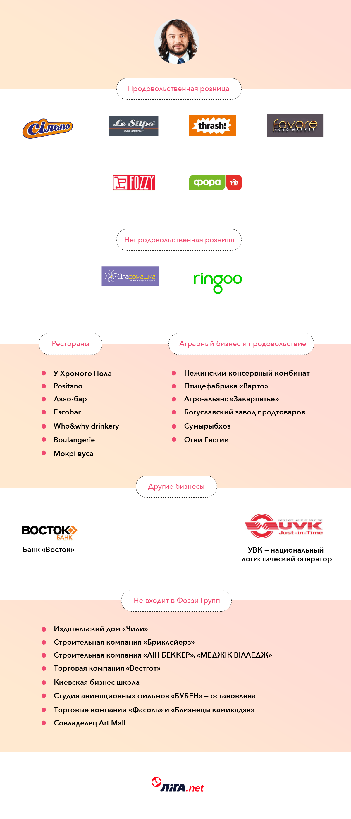 Почавши з торгівлі, засновники Fozzy Group створили багатопрофільний бізнес, що включає FMCG-рітейл (Сільпо, Фора, Le Silpo, Thrash! Траш, Fozzy C & C), мережу аптек Біла ромашка і мережу магазинів зв’язку та гаджетів ringoo. Крім того, компанія займається ресторанним і аграрним бізнесом, виробництвом продуктів харчування (м’ясокомбінат, птахофабрика, рибне господарство та інше). В активах групи є також банк Восток, турагентство Сільпо Вояж і національний логістичний оператор УВК. Раніше група включала також і поштового оператора Justin, але цей проект був закритий.