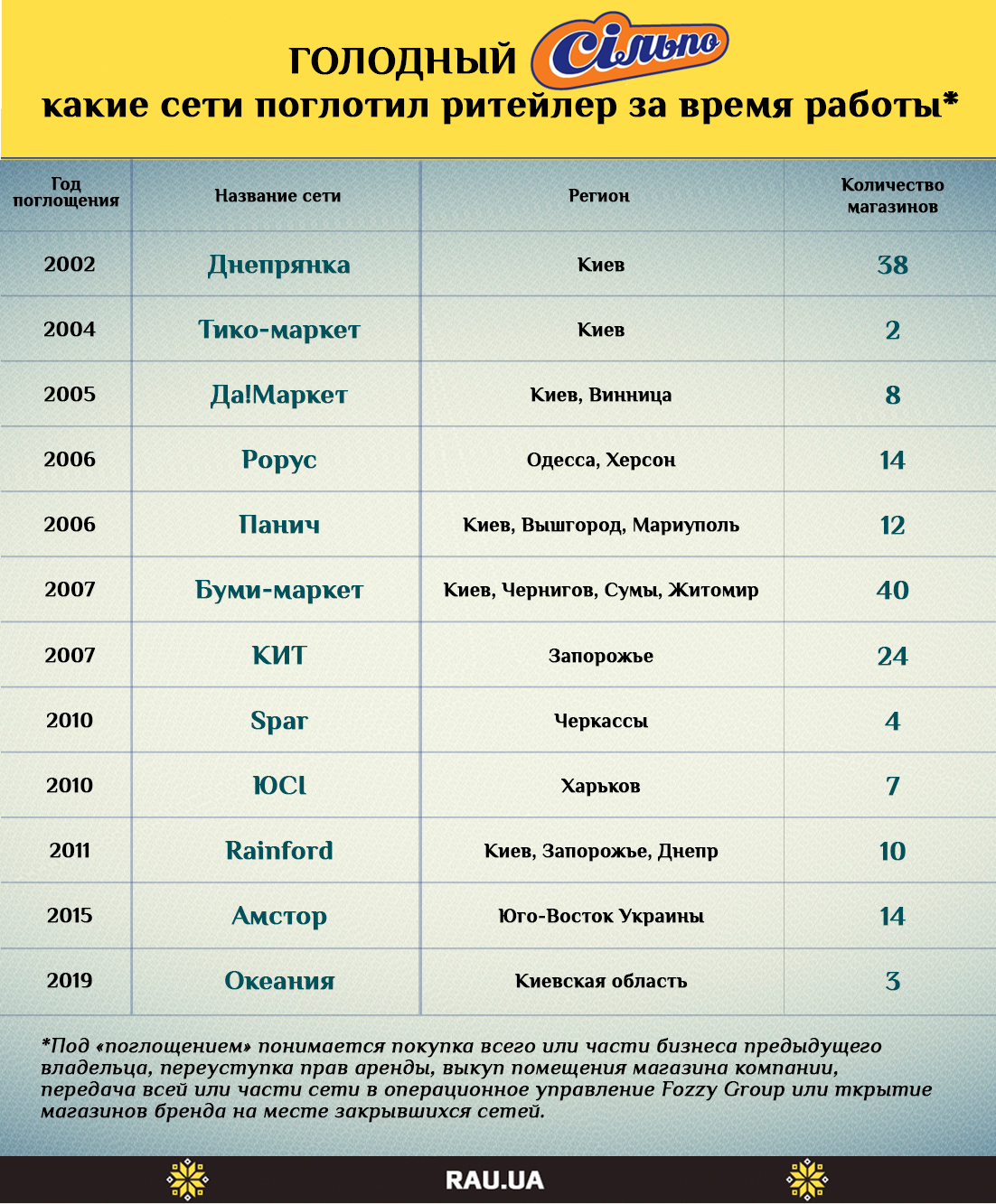 - В процесі розвитку Fozzy Group неодноразово використовувала злиття і поглинання для масштабування бізнесу, в тому числі – мережі Сільпо. Більшість угод компанія провела в «золотий» для української економіки час – в період з 2004-го по 2008 рік. Всього за 23 роки роботи група зробила 12 операцій по поглинанню конкурентів.