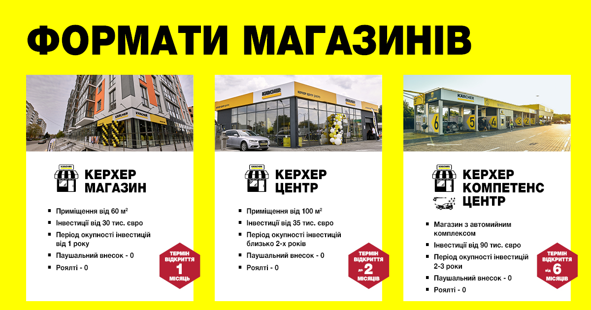 - Магазин Керхер – потребує інвестицій від 30 000 євро, з яких активн 60% на закупку товару для продажу (актив для кожного формату магазинів), приміщення від 60 кв. м. Термін відкриття становить один місяць, період окупності – від 1 року, нульові паушальний внесок та роялті;