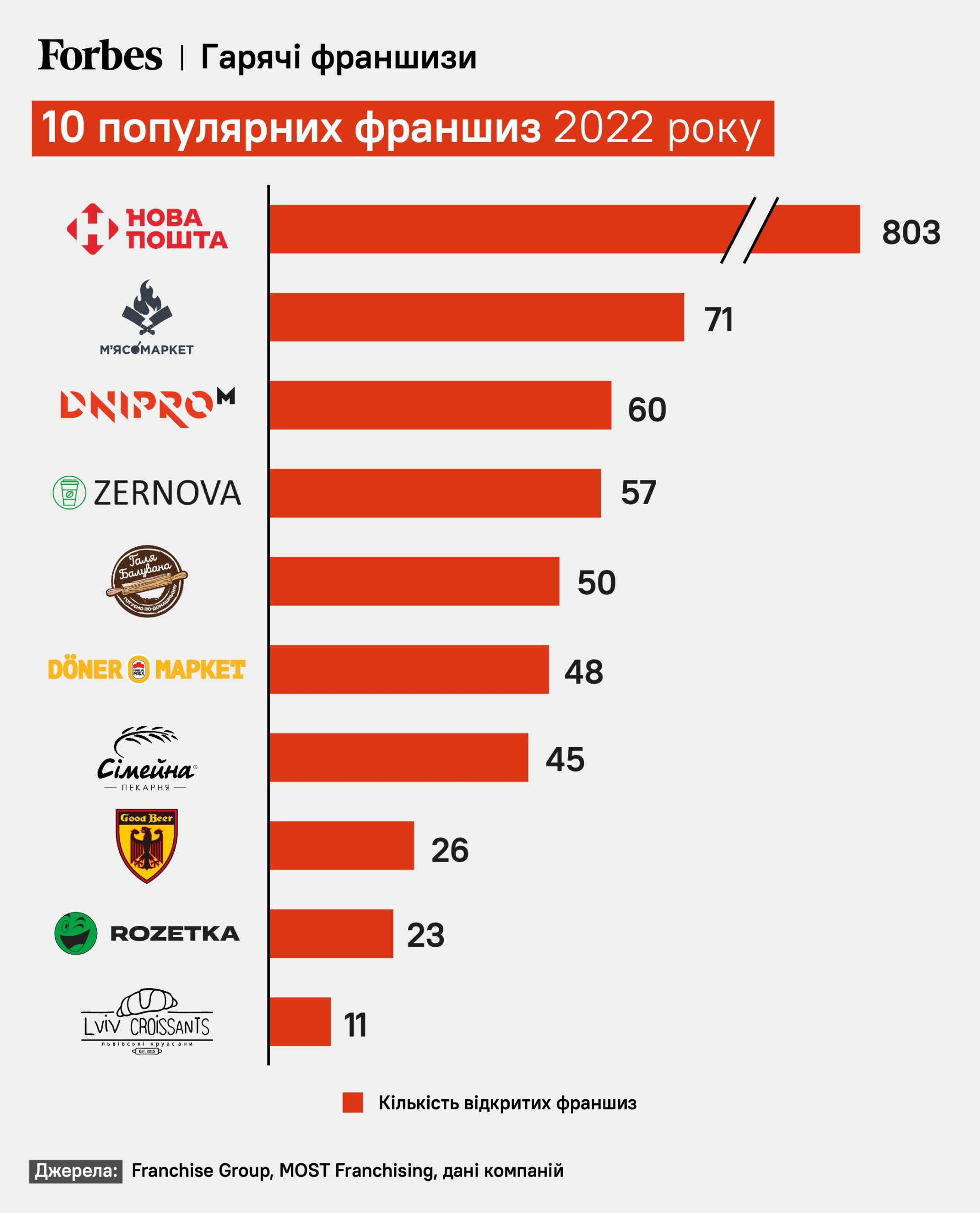 Хрестоматійний приклад широко відомого та впізнаваного бренду – Нова пошта, яка відкрила торік 803 відділення за системою франчайзингу. Ця франшиза має доступний поріг входу та високу впізнаваність бренда.Так само мережа електроінструментів Dnipro-M за 2022 рік відкрила 60 франчайзингових точок (26 уже цьогоріч).