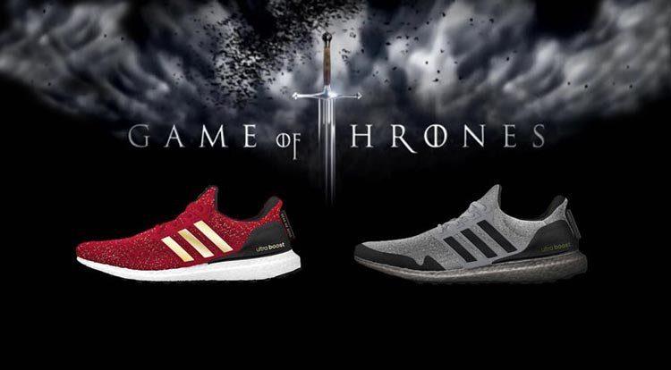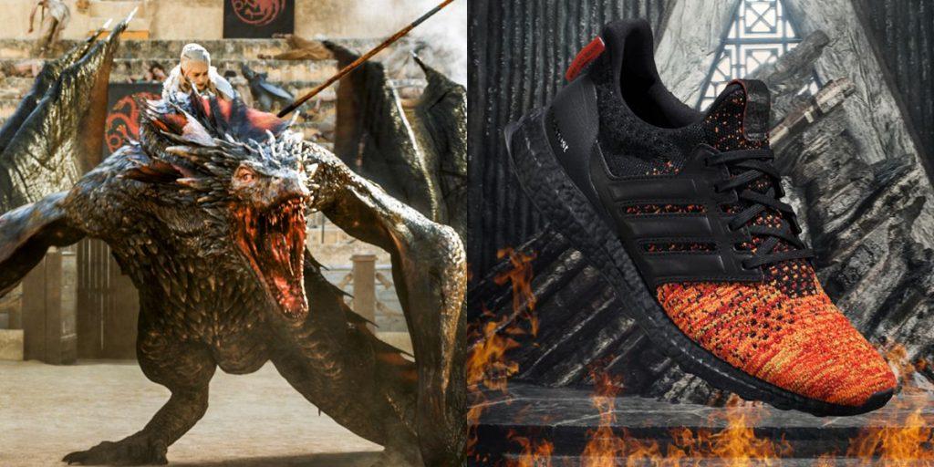 adidas уявили, в яких би кросівках ходили ті чи інші герої серіалу і випустили лімітовану колекцію взуття. На кожній парі – лейбл зі слоганом одного з Великих Домів. На кросівках будинку Старків – “Зима близько”, Таргарієнів “Полум’я і кров” та ін.