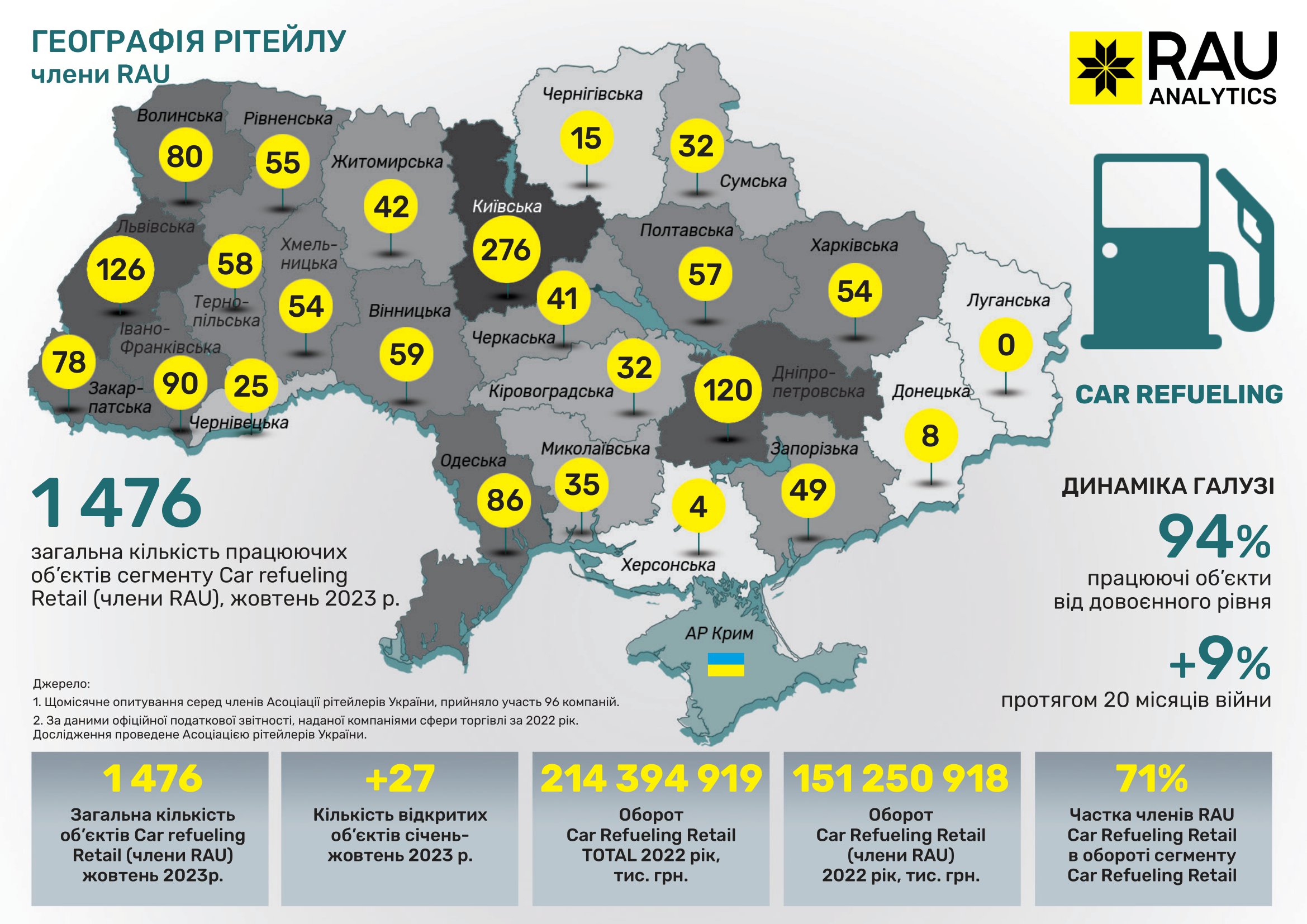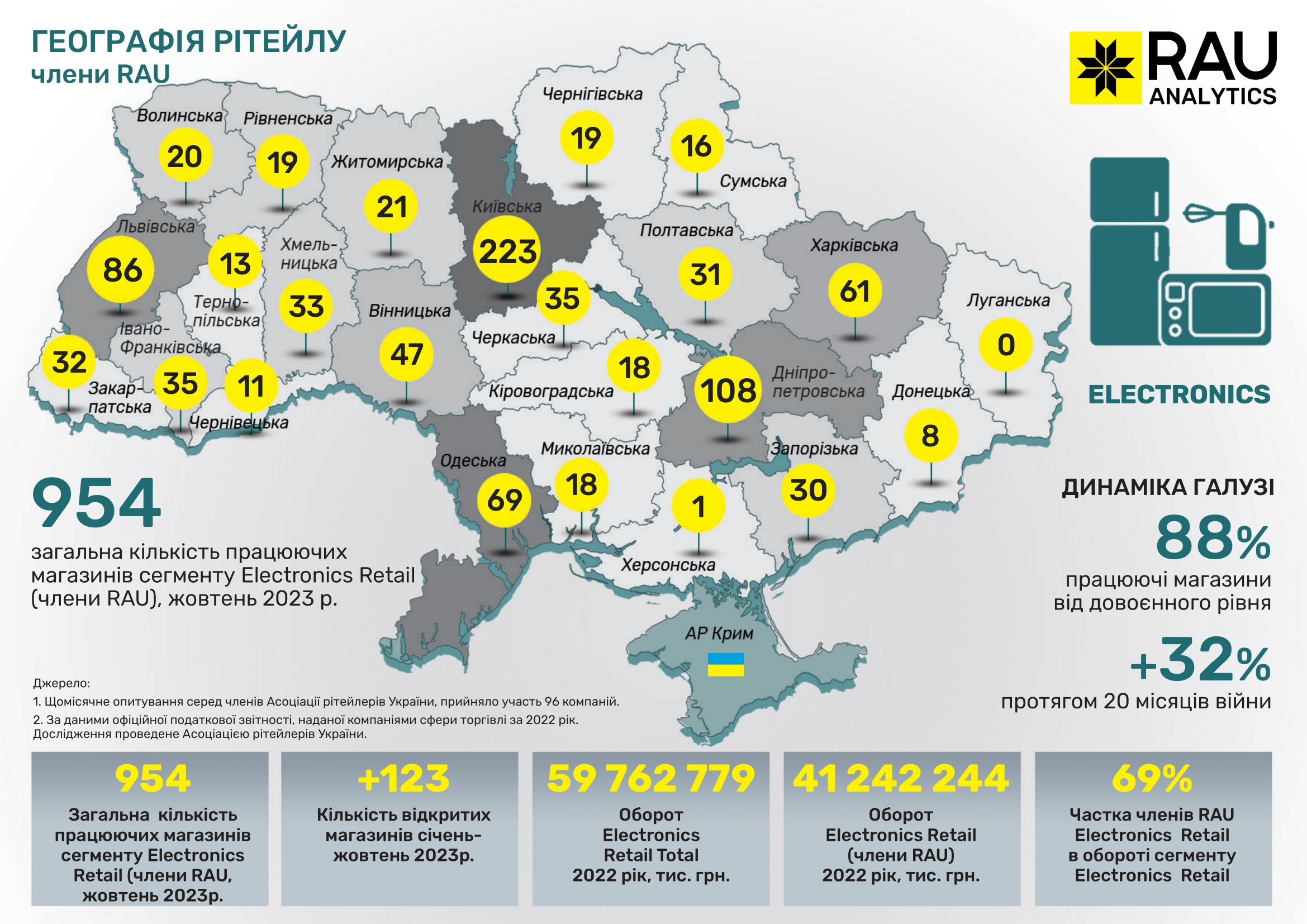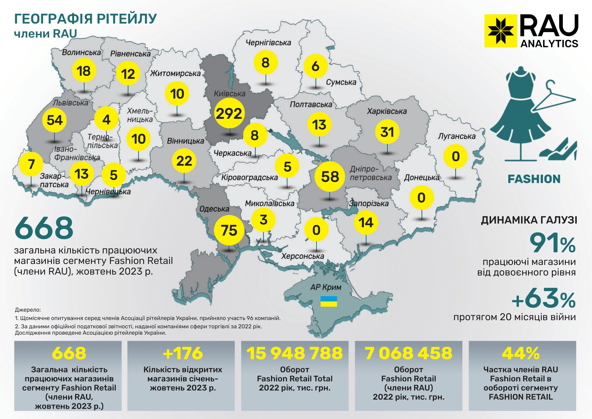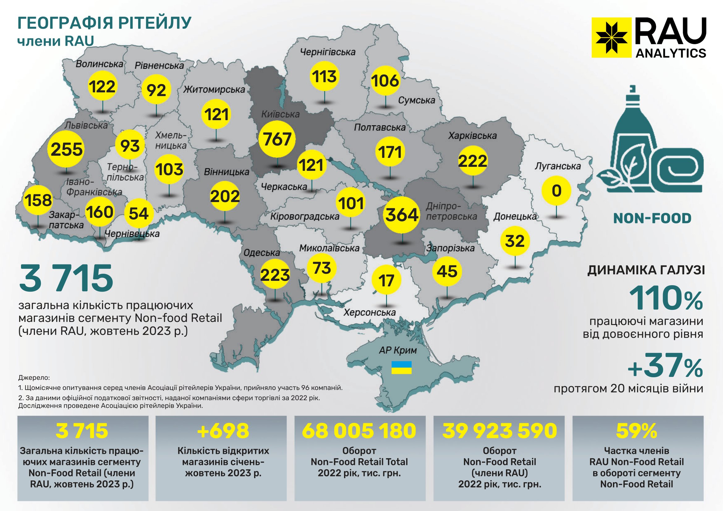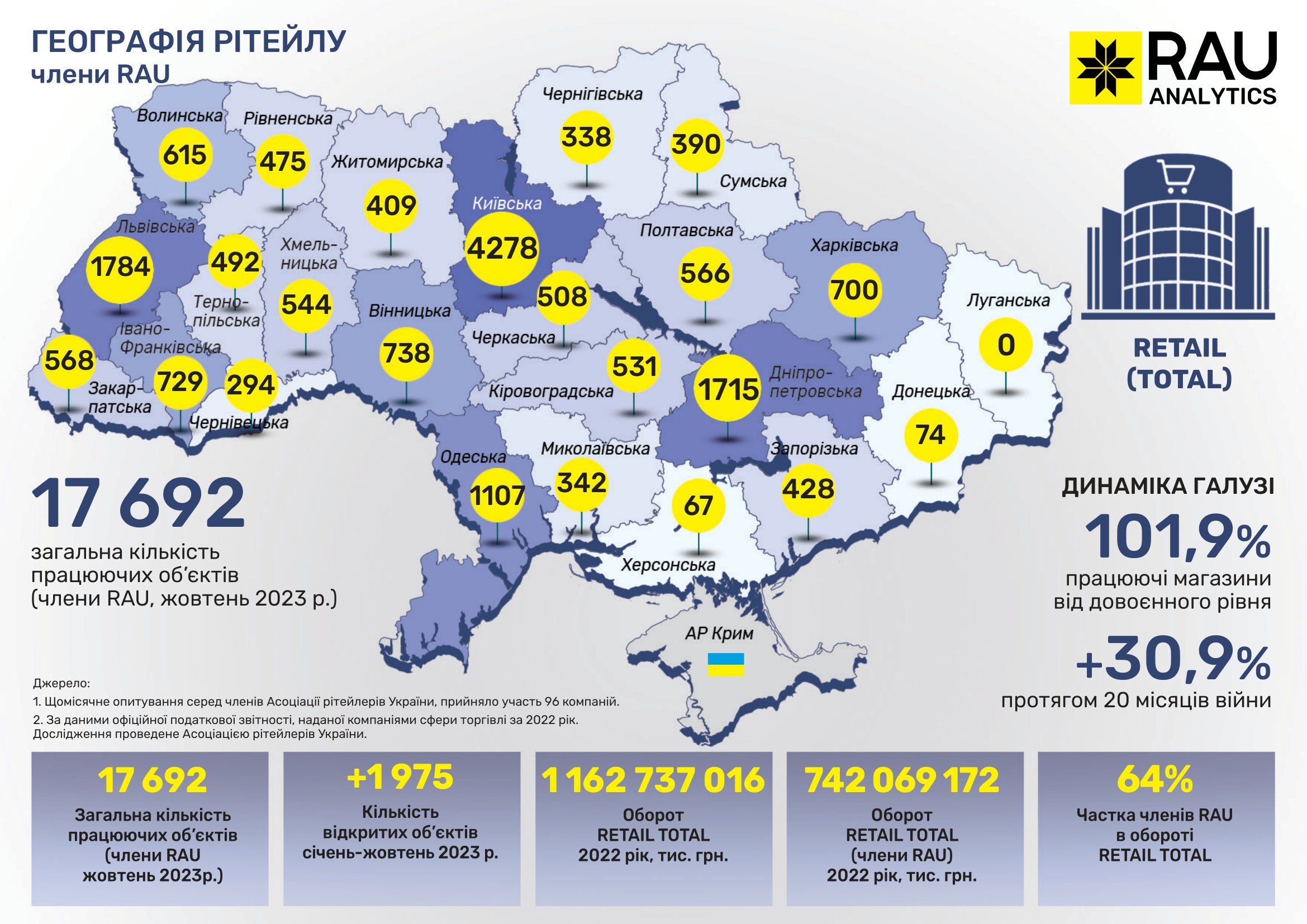 Як показало регулярне щомісячне опитування RAU, проведене серед сотні членів Асоціації рітейлерів, станом на жовтень 2023 року в них працювало 17 692 торговельні точки в дев’яти основних галузях рітейлу (з урахуванням сектору розваг). Це насамперед продовольчий та непродовольчий рітейл, аптечна торгівля, магазини з продажу одягу, взуття та аксесуарів, а також продавці техніки, електроніки та гаджетів. До них додалися мережі АЗК, магазини з продажу ювелірних виробів та прикрас й сегмент DIY мереж. У порівнянні з довоєнними показниками, кількість працюючих магазинів на середину осені поточного року продемонструвала позитивну динамку, склавши 101,9%. Тобто можна вже говорити не тільки про відновлення галузі, а й про її подальший розвиток (+1,9%).