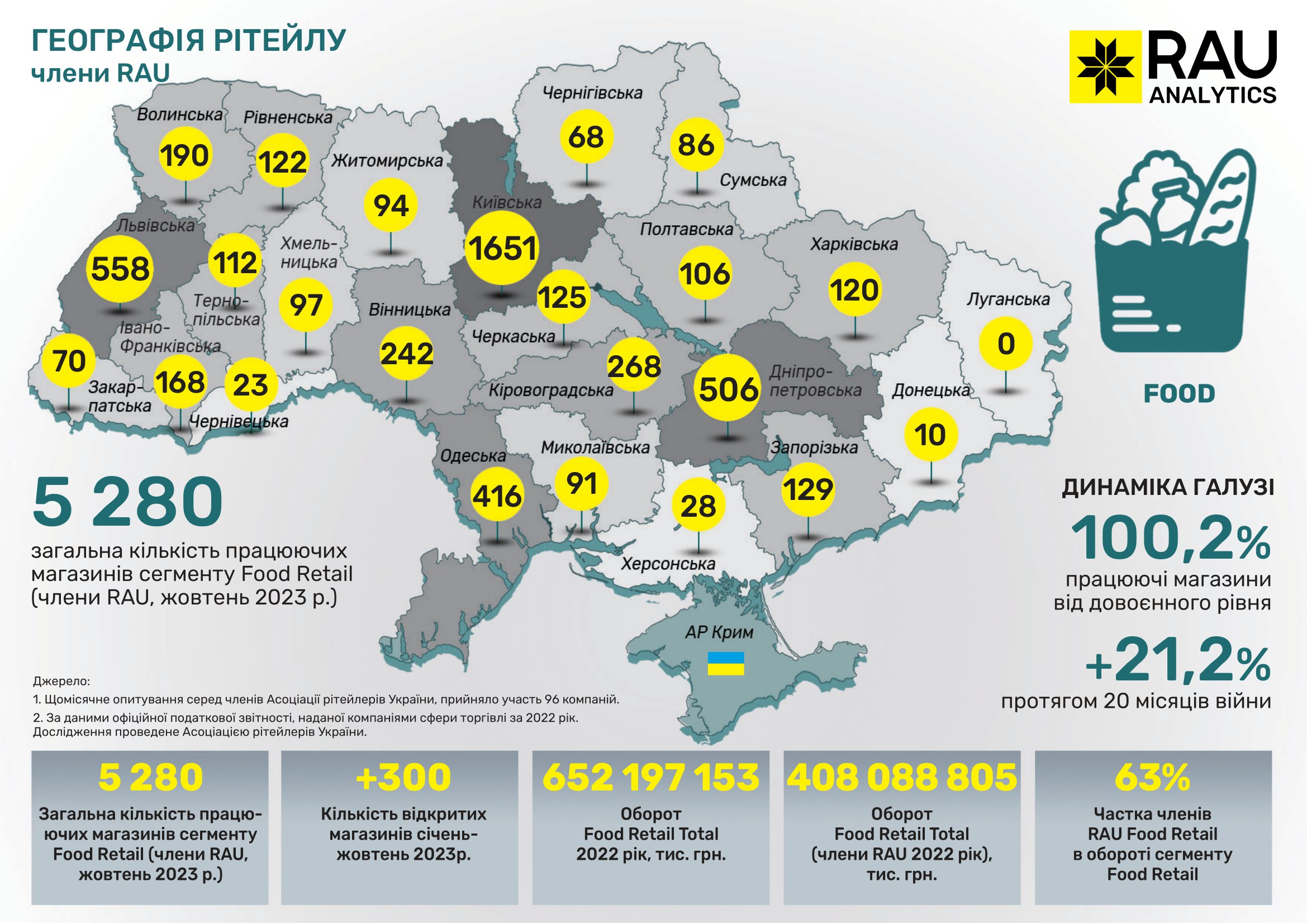 Загалом за 20 місяців війни галузь відновилася на 21,2%. Найбільша концентрація продовольчого рітейлу спостерігається в Києві та області – 1651 торгових точок, що втричі перевищує щільність покриття ще двох регіонів з максимальною кількістю магазинів. Так, на другому місці за кількістю магазинів є Львівська область (558), а на третьому – Дніпропетровська (506). В п’ятірку також входять Одеська та Кіровоградська області. Найменше продуктовий роздріб представлений в прифронтових регіонах Донецької (10) та Херсонської областей (28), а також у невеликою за своїм розміром Чернівецкій області (23). Загалом на інші регіони припадає в середньому по 70-120 магазинів.
