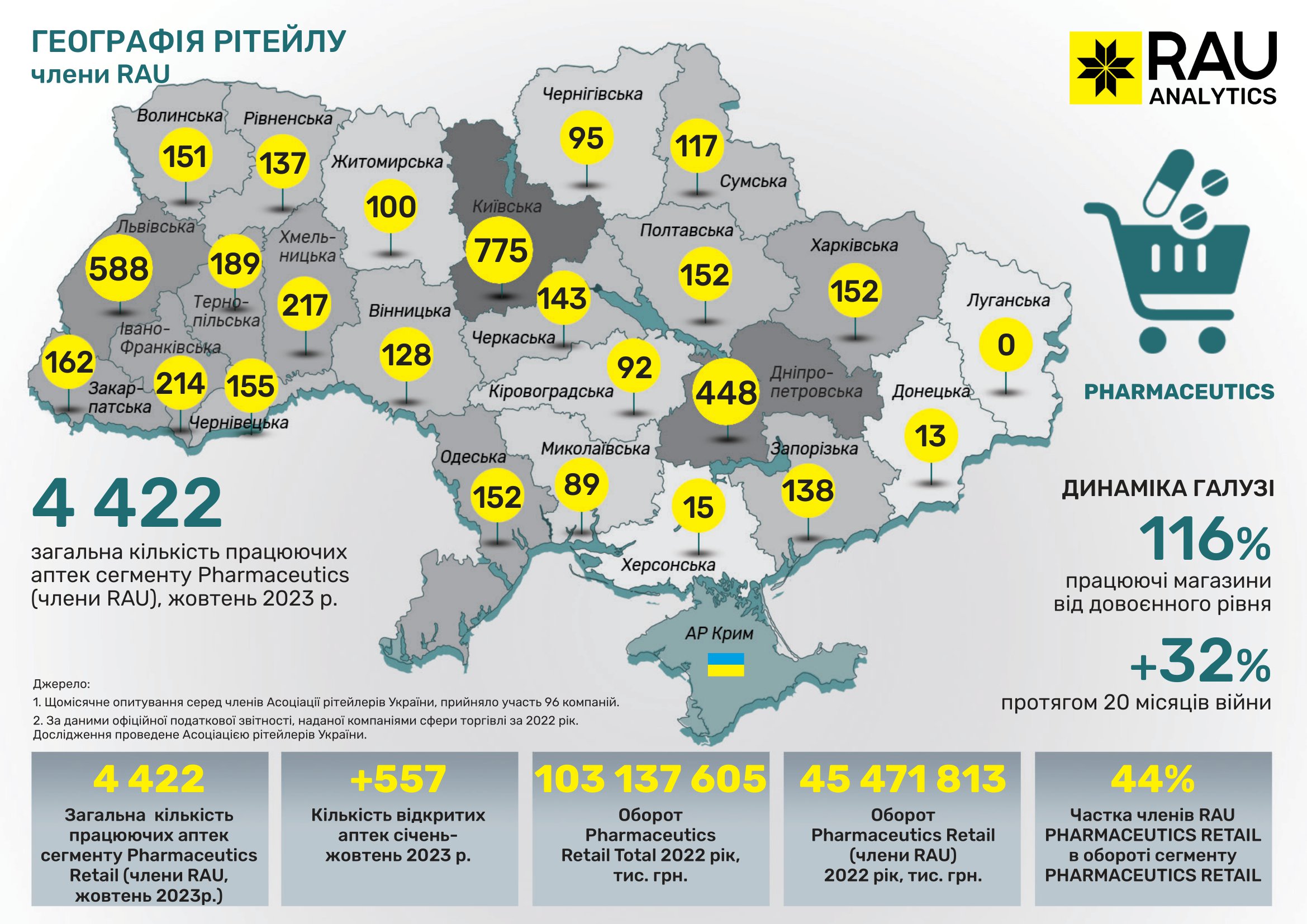Найбільш динамічний розвиток демонструють аптечні мережі, на які припадає чверть всієї кількості торгових точок різних галузей. Наразі в Україні працює 4422 аптеки, що становить 116% по відношенню до довоєнних показників. І це найбільше число приросту (16%) серед інших сфер рітейлу. За 10 місяців поточного року було відкрито 557 аптек. Загалом же за 20 місяців війни галузь додала 32%, сконцентрувавши основну кількість торгових точок в столичному регіоні – 775. Подібно до продовольчих магазинів аптеки «гуртуються» найбільше у Львові (588) та Дніпрі (448). Цікаво, що чим далі на захід країни – тим більша концентрація фармацевтичних мереж. Так, у Хмельницькій області та на Івано-Франківщині налічується більше 200 торгових точок. А на Закарпатті та у Чернівецькій області їх у кілька разів більше ніж продуктових маркетів.