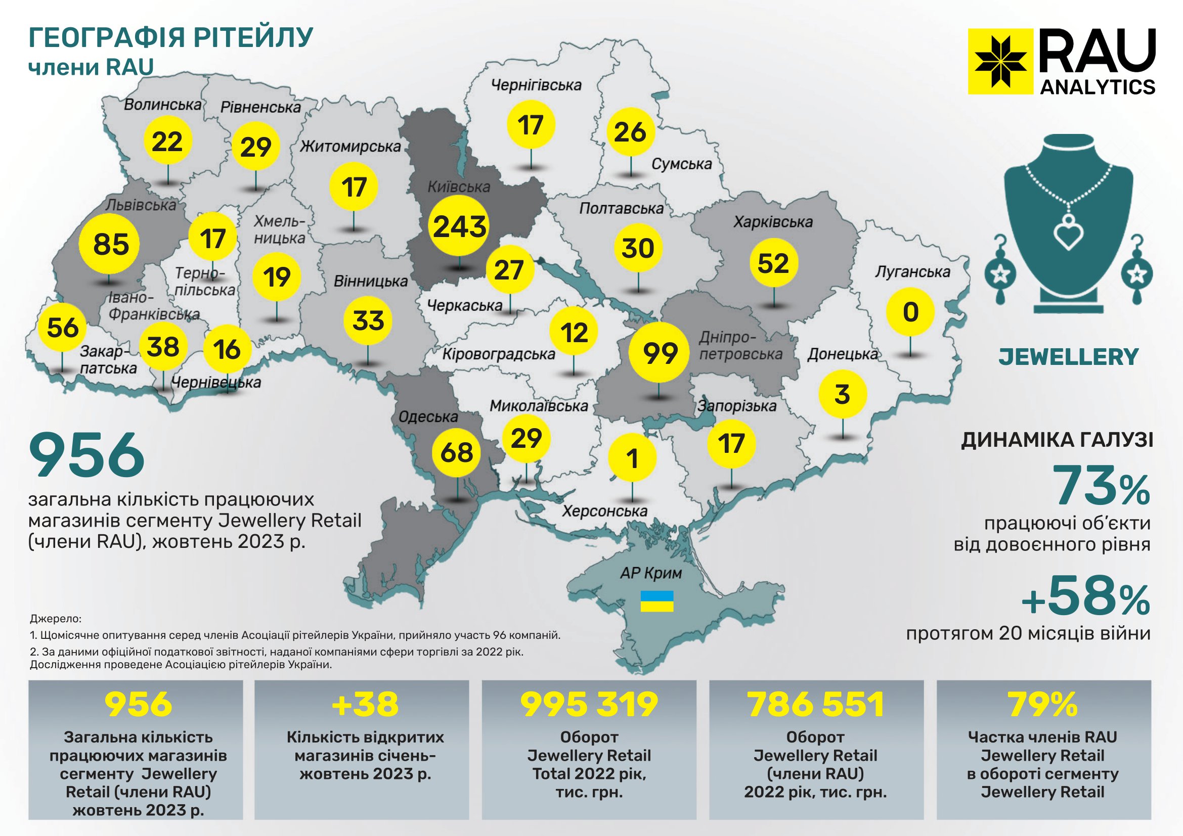 Торгівля ювелірними виробами, очевидно, постраждала найбільше від російського вторгнення. Так, станом на осінь нинішнього року працювало тільки 956 точок, або лише 73% довоєнного рівня. Однак і відновлення галузі відбувалося більш суттєво – за 20 місяців війни відновилося 58% торгових точок.