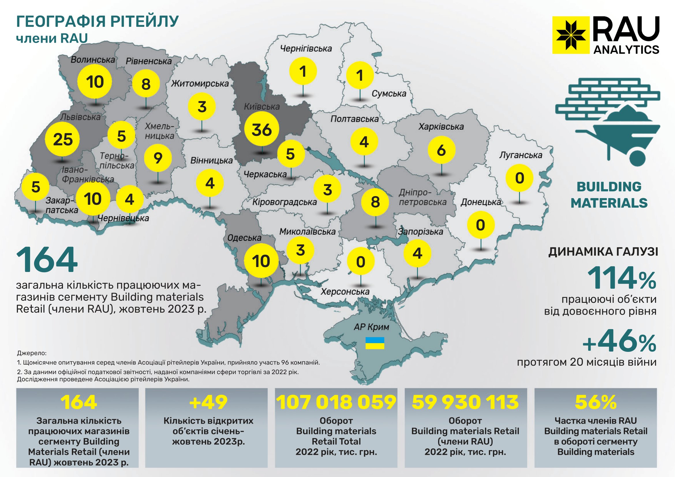 Основна частина торгівлі, як бачимо, також зосереджена у столичному регіоні – 36 магазинів, або п’ята частина всіх торгових точок даної сфери. В трійку регіонів з найбільшою концентрацією будівельних магазинів також входить Львівська область (25 точок) та одразу три регіони з десятком магазинів у кожному: Одеська, Волинська та Івано-Франківська. Далі на схід виділяються Дніпропетровська та Харківська області.