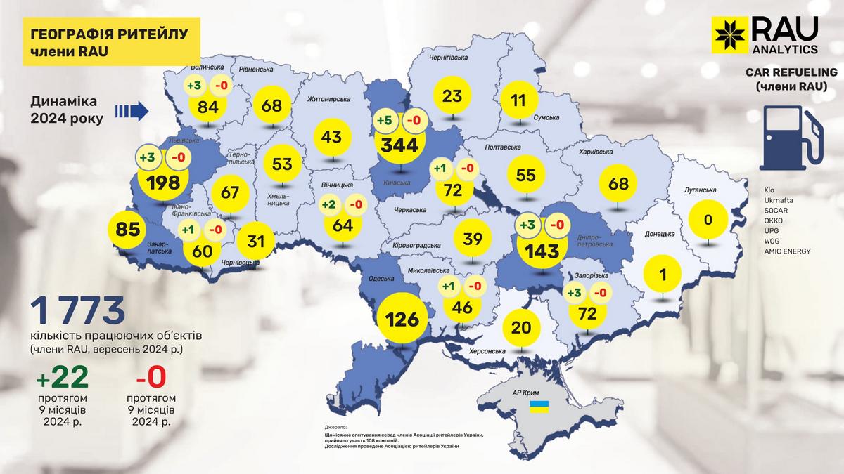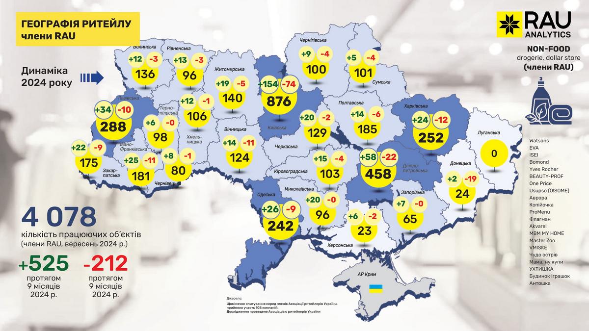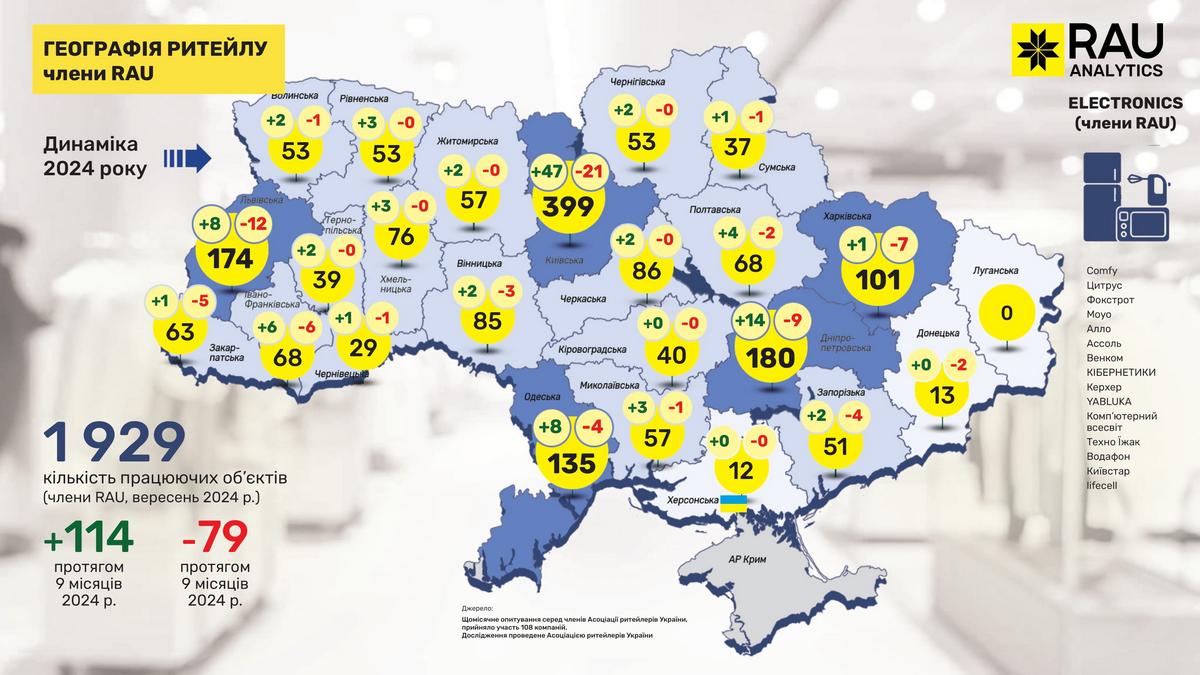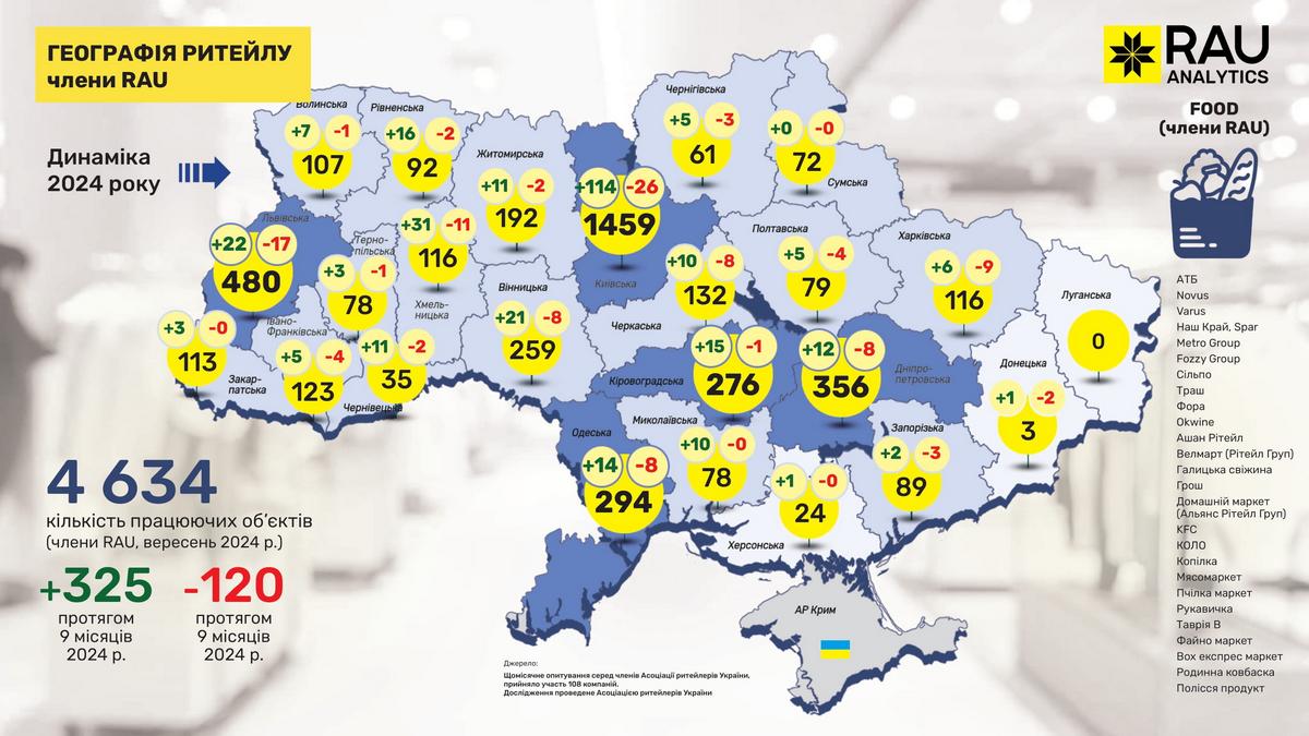 Як показало регулярне щомісячне опитування RAU, проведене серед 108 членів Асоціації ритейлерів, станом на вересень 2024 року в них працювало вже 22 073 торговельних точок у восьми основних галузях ритейлу. Мова йде про продовольчий і непродовольчий ритейл, аптечну торгівлю, fashion, а також продавців техніки й електроніки, мережі АЗК, магазини з продажу ювелірних виробів та сегмент DIY-мереж.