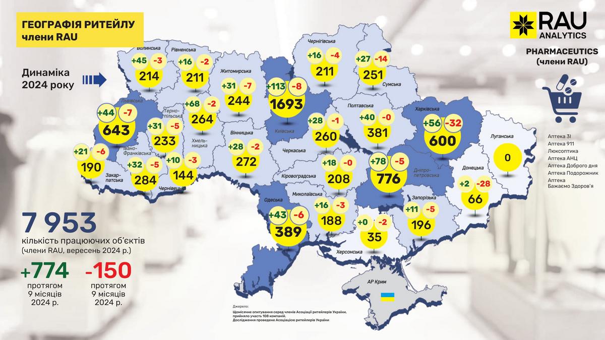 За 9 місяців 2024 року було відкрито 774 аптеки і це найвищий показник серед усіх сегментів ритейлу. При цьому кількість закритих аптек складає всього 150 закладів, тобто чистий приріст – 624 аптеки.