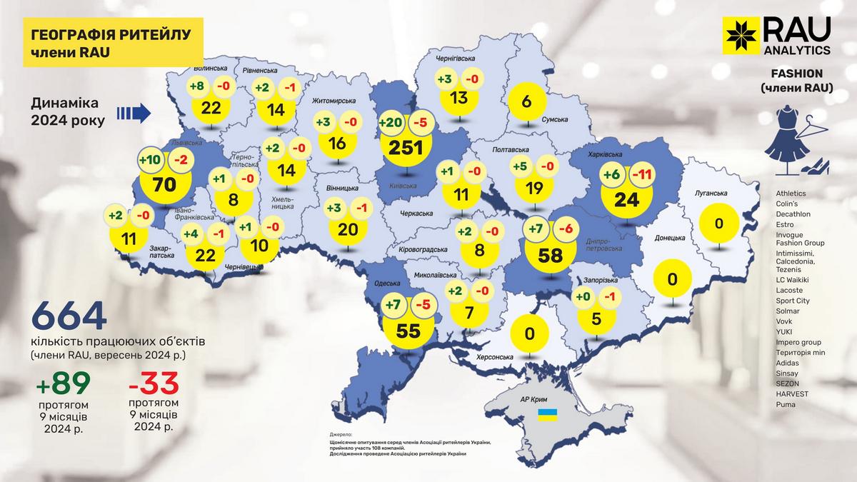 Сфера торгівлі одягом, взуттям та аксесуарами теж суттєво постраждала від повномасштабного вторгнення. Враховуючи цей фактор і зниження купівельної спроможності населення, загалом ця сфера непогано відновлюється. Станом на вересень 2024 року в Україні працювало 664 магазини. Це на 56 точок більше, ніж на початку року, враховуючи, що на 89 відкритих припало 33 закритих магазини. Загалом можна казати про досягнення певного балансу в даній галузі, оскільки в більшості регіонів ситуація залишилася незмінною.