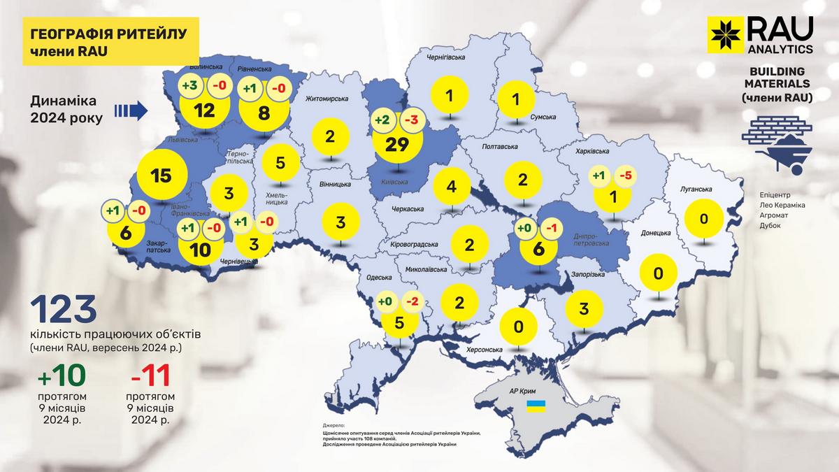 Основна частина торгівлі зосереджена у столичному регіоні – 29 магазинів, або чверть всіх торгових точок даної сфери. В трійку регіонів з найбільшою концентрацією будівельних магазинів також входить Львівська (15 точок) та Волинська (12) області. В останній додалися одразу три нові торгівельні точки, що свідчить про більшу концентрацію будівельного ритейлу на заході країни. Відповідно, чим далі на схід, тим менше подібних магазинів і навіть у місцях великої концентрації цього виду ритейлук спостерігається скорочення числа торгових точок як у Києві, Дніпрі, Одесі та Харкові.