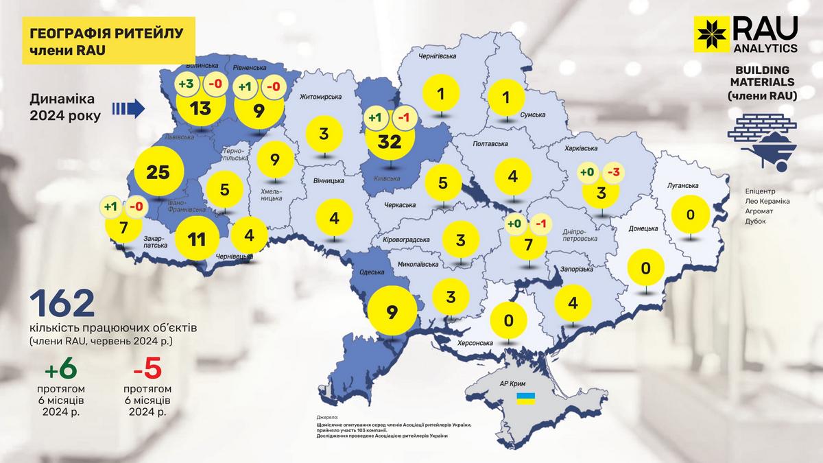Як показало регулярне щомісячне опитування RAU, проведене серед більш ніж сотні членів Асоціації ритейлерів, станом на червень 2024 року в них працювало вже 19 555 торговельних точок у восьми основних галузях ритейлу. Мова йде про продовольчий і непродовольчий ритейл, аптечну торгівлю, fashion, а також продавців техніки й електроніки, мережі АЗК, магазини з продажу ювелірних виробів та сегмент DIY-мереж.