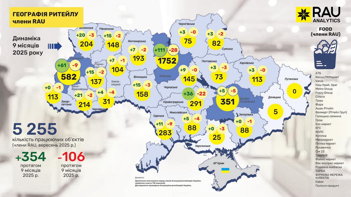 Як показало регулярне щомісячне опитування RAU, проведене серед 112 членів Асоціації ритейлерів, станом на жовтень 2025 року в них працювало 24 178 магазинів у семи основних галузях ритейлу. Мова йде про продовольчий і непродовольчий ритейл, fashion, а також продавців техніки й електроніки, мережі АЗК, магазини з продажу ювелірних виробів та сегмент DIY-мереж. За січень-вересень 2025 року ритейлери загалом відкрили 1658 магазинів і закрили 534. Таким чином українські торгівельні мережі розширилися на 1124 торгових об’єкти.