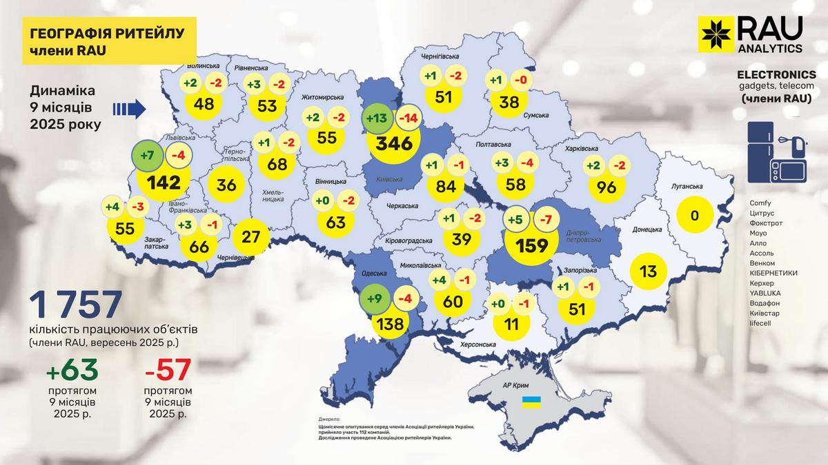 У вересні 2025 року в Україні працювало 1757 магазинів техніки та електроніки. За три квартали 2025-го ритейлери відкрили 63 нових магазини, але за рахунок того, що 57 об’єктів торгівлі припинили роботу за цей період, фактично додалося тільки шість магазинів. Київська, Львівська та Дніпропетровська області є лідерами по концентрації цього виду ритейлу. Але тільки на Львівщині є фактичний приріст. Також звертає на себе увагу Одещина, де нараховується 138 працюючих магазинів, а реальний приріст більший ніж де інде.