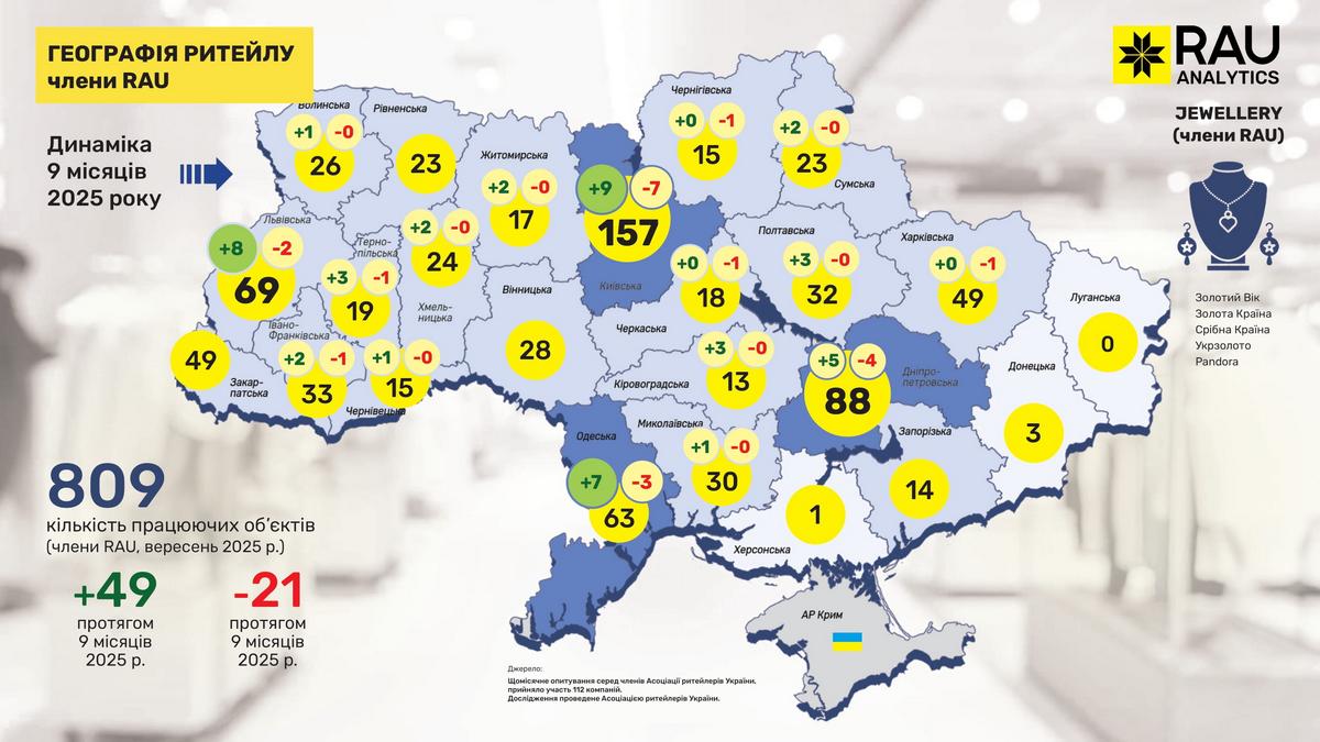 Торгівля ювелірними виробами нараховує 809 магазинів компаній-членів RAU. За дев’ять місяців додалося 49 магазинів, хоча й закритих виявилося чимало. В результаті виходить лише на 28 магазинів більше. П’ята частина торгових точок припадає на столичний регіон – 157. Найбільша концентрація jewelry ритейлу в столичному регіоні, на Дніпропетровщині та на Львівщині. Зокрема, у Львові та області найбльший фактичний приріст – 6 нових магазинів. Помітний приріст також є також в Одесі.