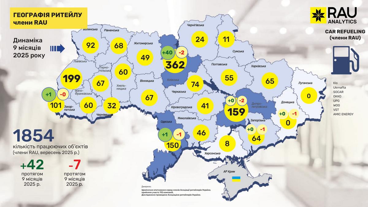 Станом на вересень поточного року кількість АЗК у компаній-членів RAU досягла рівня в 1854 заправних комплекси. Це на 35 заправок більше, ніж у 2024-му, враховуючи закриття семи і відкриття 42 нових АЗК. Майже всі нові АЗК зосередилися в столичному регіоні. Та й по концентрації заправок Київ та область на першому місці, випереджаючи Львів та Дніпро: 362 проти 199 і 159 АЗК відповідно. Проте в цих регіонах розширення мереж не зафіксовано. Окрім столиці лише на Закарпатті додалася одна нова заправка.
