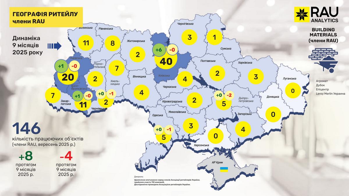Retail Association of Ukraine представляє чергове ексклюзивне аналітичне дослідження під назвою “Географія ритейлу”. На основі даних мереж, які є членами RAU, була зібрана та узагальнена інформація про те, як змінилася географія ритейлу за 9 місяців 2025 року, та яка динаміка розвитку галузі по регіонам.