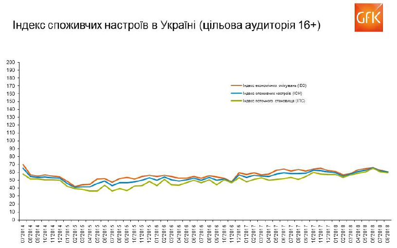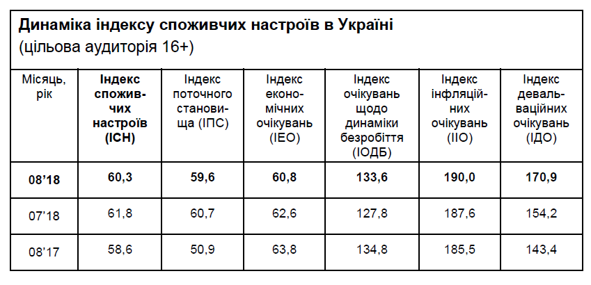 У серпні-2018 індекс споживчих настроїв склав 60,3, що на 1,5 п. менше, ніж в липні. Найбільших змін зазнав індекс девальваційних очікувань.