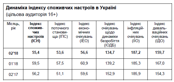В лютому 2018 року індекс споживчих настроїв (ІСН) склав 55,4, що на 4,2 п. менше, ніж у січні 2018 року.