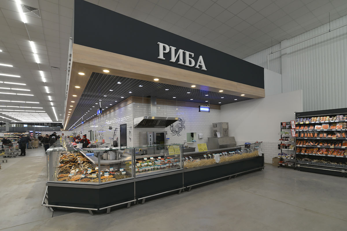 У рибному відділі пропонується найсвіжіша морська та річкова риба, повсякденна або делікатесна: сібас, дорада, сом, форель, товстолобик, барабулька, короп, карась, камбала, глоська, лосось і навіть французькі устриці двох видів, восьминоги, охолоджені кальмари тощо. Представлений і широкий асортимент сушеної риби та морепродуктів: анчоус, жовтий полосатик, тріска, тунець, кальмар, восьминіг, в’ялена: тарань, камбала, мойва, густера.