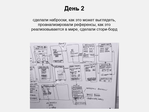 - Другий день. Ми скетчили (малювали) рішення, які можуть допомогти клієнтам. Можна шукати ідеї на інших ринках. Наприклад, якщо у вас продуктовий магазин, то можна перейняти досвід fashion-рітейлерів. Закінчили другий день підготовкою розкадровки: як клієнт буде з нами взаємодіяти.
