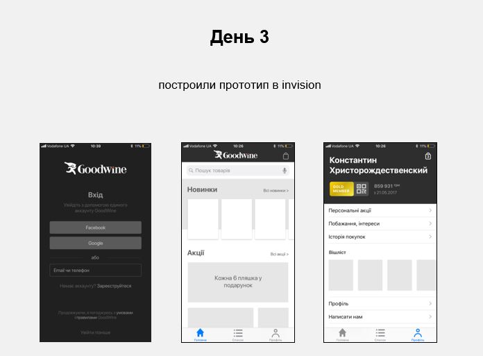 - На третій день дизайнер намалював клікабельний прототип додатку. Ми малювали в InVision – програма дозволяє дизайнеру продемонструвати прототип дизайну додатку, зробити його інтерактивним. Розкадрування, яке ми підготували до цього, сталр схоже на мобільний додаток.