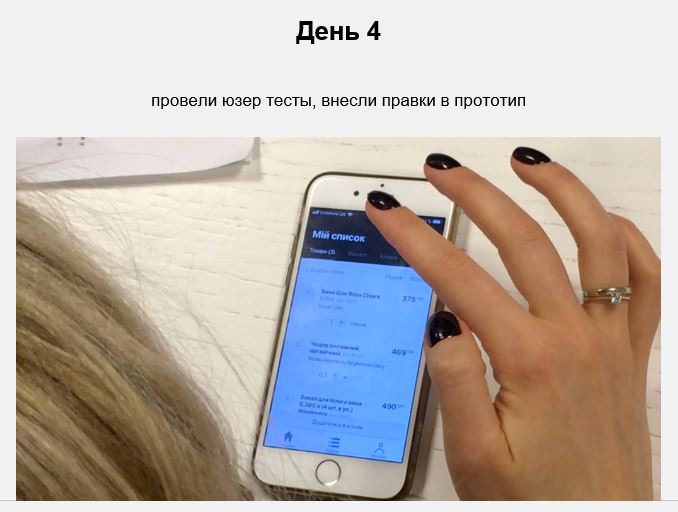 - Четвертий день. Даємо тестувати додаток клієнту на мобільному телефоні. Я запросила в Facebook п’ять чоловік, які першими відгукнулися. По 40 хвилин виділили на людину, після кожного тесту обговорювали з дизайнером, що і як потрібно поміняти. При зустрічі з клієнтом потрібно просто його слухати, просити промовляти бажані дії, і ніколи не ставити запитань, що наводять на відповідь. Увечері вносили правки в прототип.