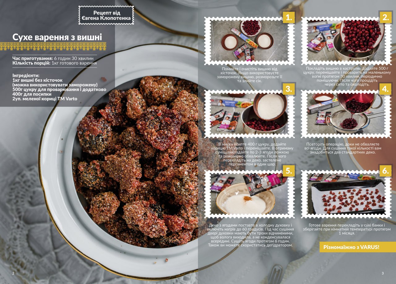 Вже традиційно каталог містить три рецепти від Євгена Клопотенка. У новому випуску «Кулінарної підтримки» він ділиться рецептом корисного аналогу звичайним цукеркам — сухого варення з вишні. Крім того, шеф-кухар розповідає, як приготувати пікантні консервовані кабачки по-корейськи та пропонує рецепт приготування незвичайної кабачкової аджики. Незмінні складові страв від Євгена — фантазія, майстерність та продукти ТМ Varto, перевірені шефом особисто.