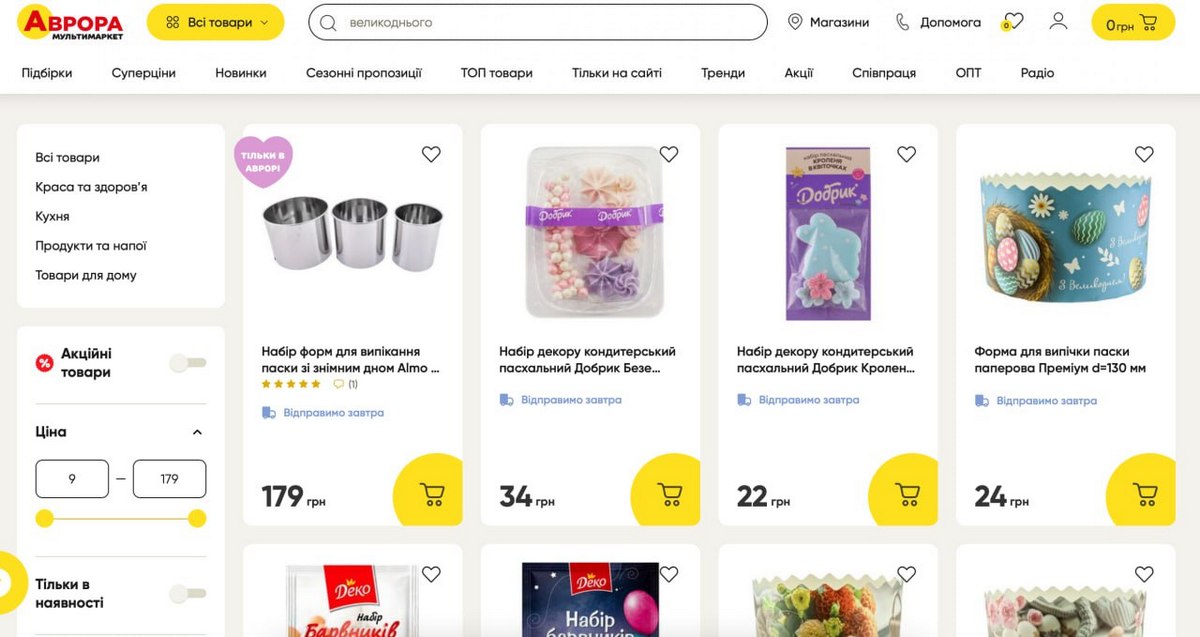 В асортименті магазинів Аврора кожен знайде щось для себе. Тут є все для підготовки до свята: зручні у використанні одноразові паперові форми для випікання пасок, глазур, кондитерські посипки, а також фігурки, посуд, декор та святковий посуд.