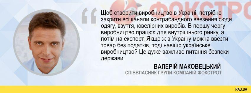 “Щоб створити виробництво в Україні, потрібно однозначно закрити всі канали контрабандного ввезення сюди одягу, взуття, ювелірних виробів. В першу чергу виробництво працює для внутрішнього ринку, а потім на експорт. Якщо ж в Україну можна ввезти товар без податків, тоді навіщо українське виробництво? Це дуже важливе питання безпеки держави”.