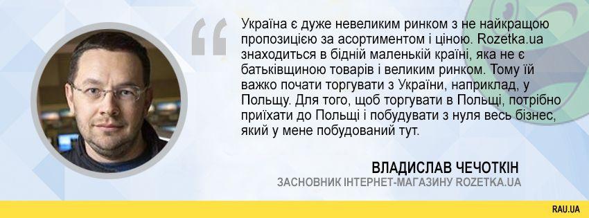 “Україна є дуже невеликим ринком з не найкращою пропозицією щодо асортименту і ціною. Rozetka.ua знаходиться в бідній маленькій країні, яка не є батьківщиною товарів і великим ринком. Тому їй важко почати торгувати з України, наприклад, до Польщі. Для того, щоб торгувати в Польщі, потрібно приїхати до Польщі і побудувати з нуля весь бізнес, який побудований у мене тут”.