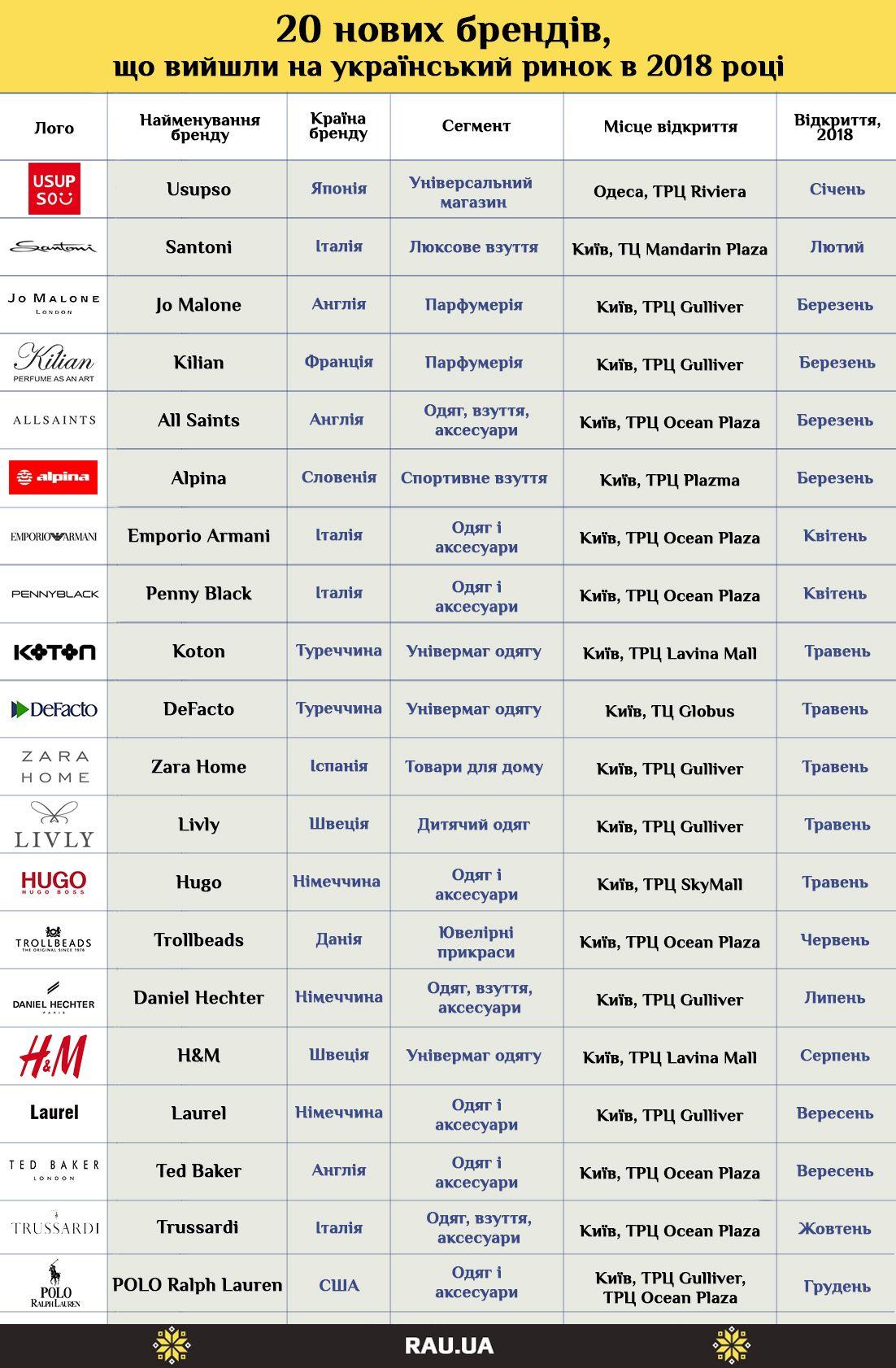 Інфографіка: 20 нових брендів, які вийшли на український ринок в 2018 році