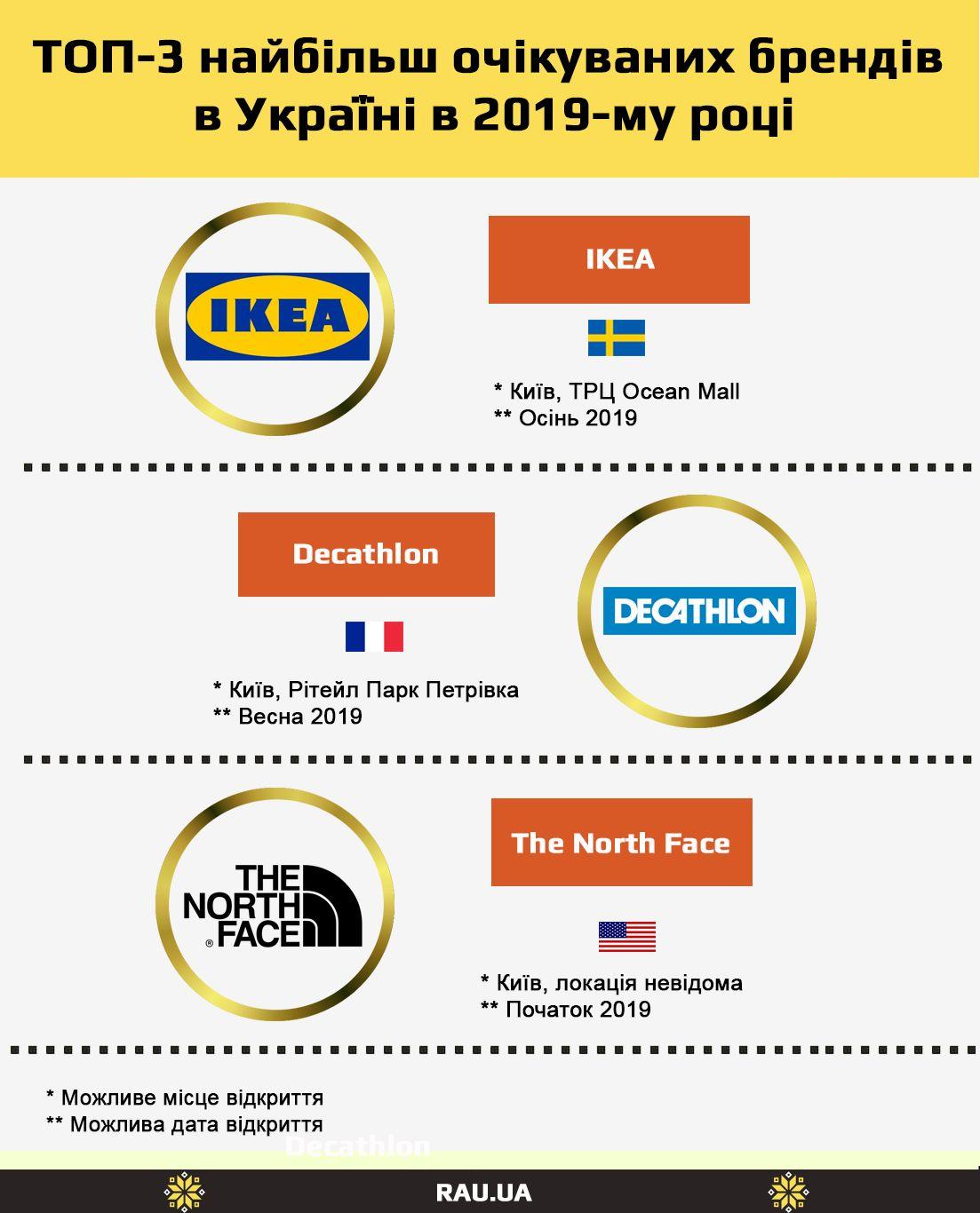 Що стосується брендів, що запланували вихід в Україну в 2019 році, то тут, без сумніву, варто відзначити шведську IKEA, французький Decathlon, та американський The North Face, який у нас в країні буде представляти компанія Intertop Ukraine. Крім цього, за інформацією JLL, в найближчі кілька років можна очікувати дебюту на українському ринку таких брендів одягу, взуття та аксесуарів, як Steve Madden, The Kooples, Coin, Karl Lagerfeld, а також гастрономічної мережі фуд-холів Eataly.