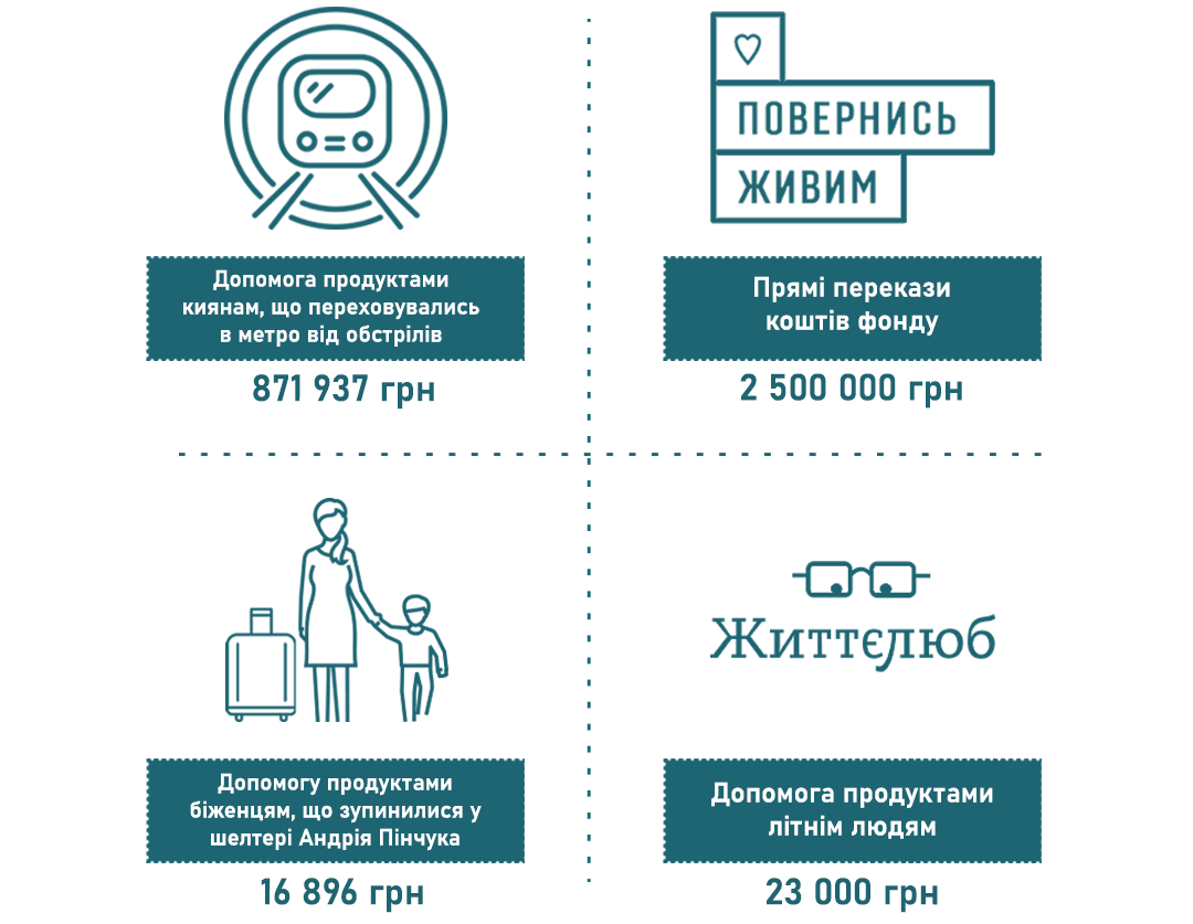 - забезпечення продуктами харчування і водою мешканців Києва, що переховувались від обстрілів в метрополітені Києва;