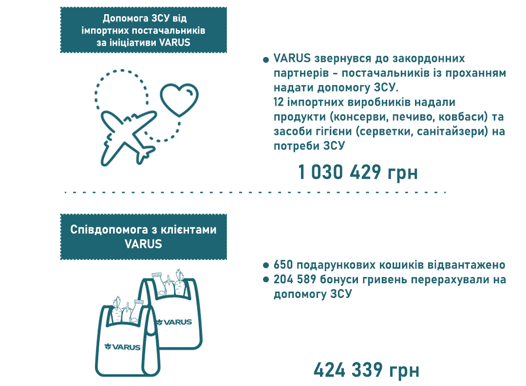 У перший же день військових дій Varus переказав 2,5 млн грн фонду “Повернись живим” на допомогу армії. Також мережа прийняла рішення про створення гуманітарного штабу Varus. Його мета: продовольча підтримка всіх, хто потребує допомоги під час війни.