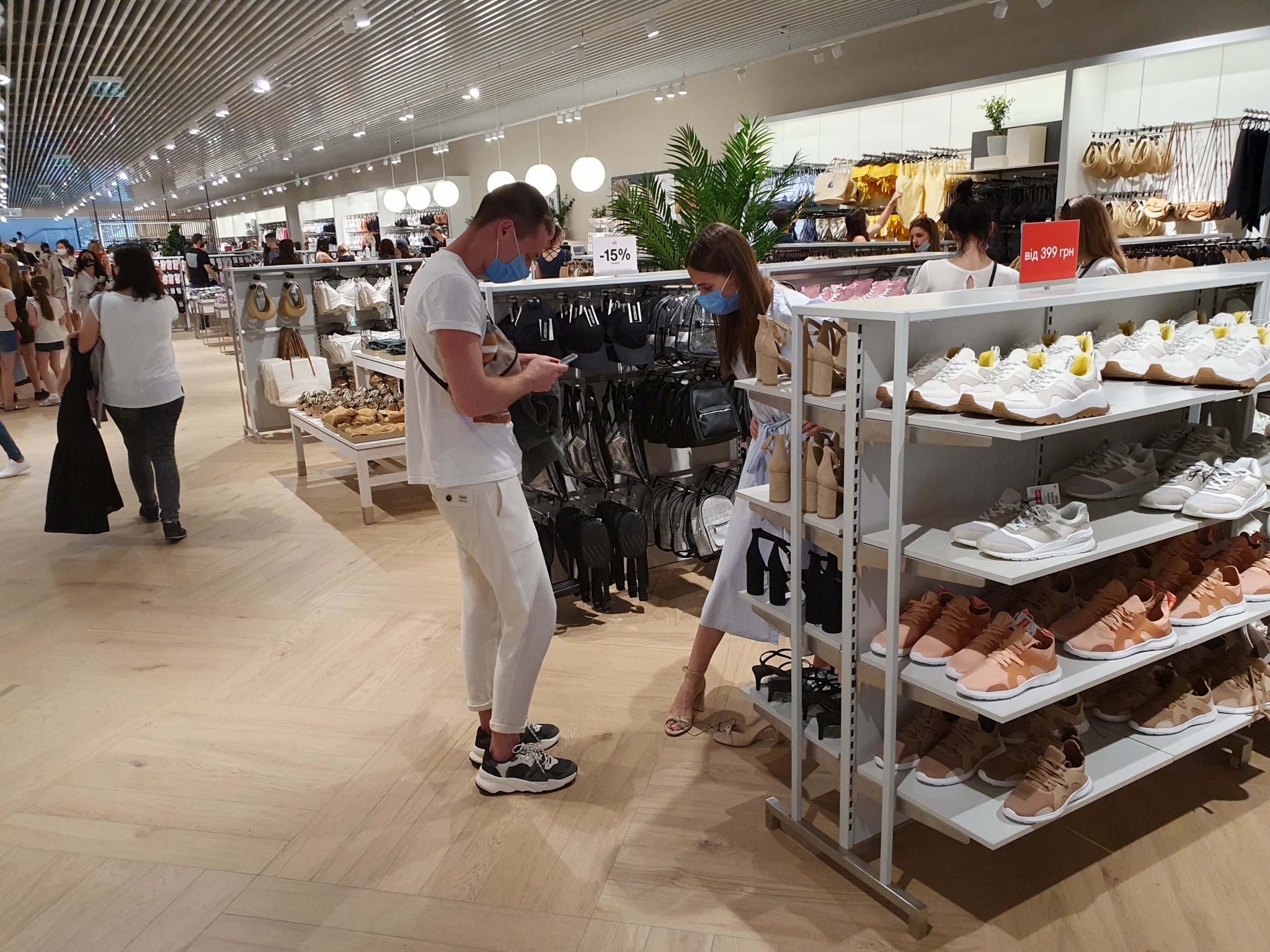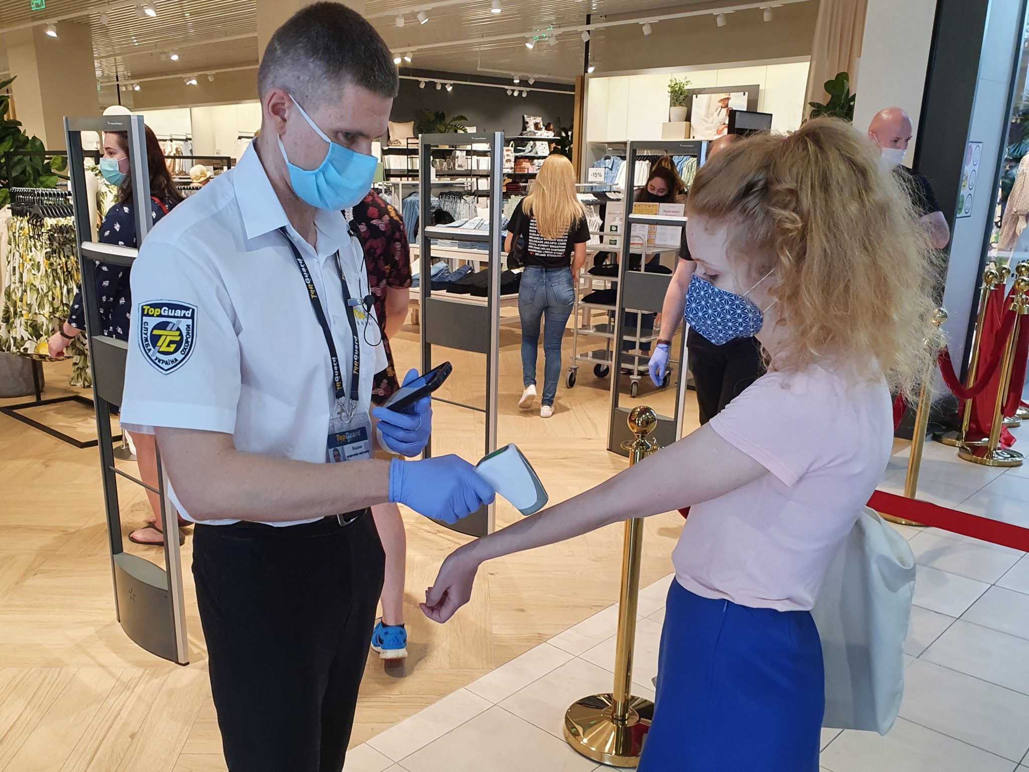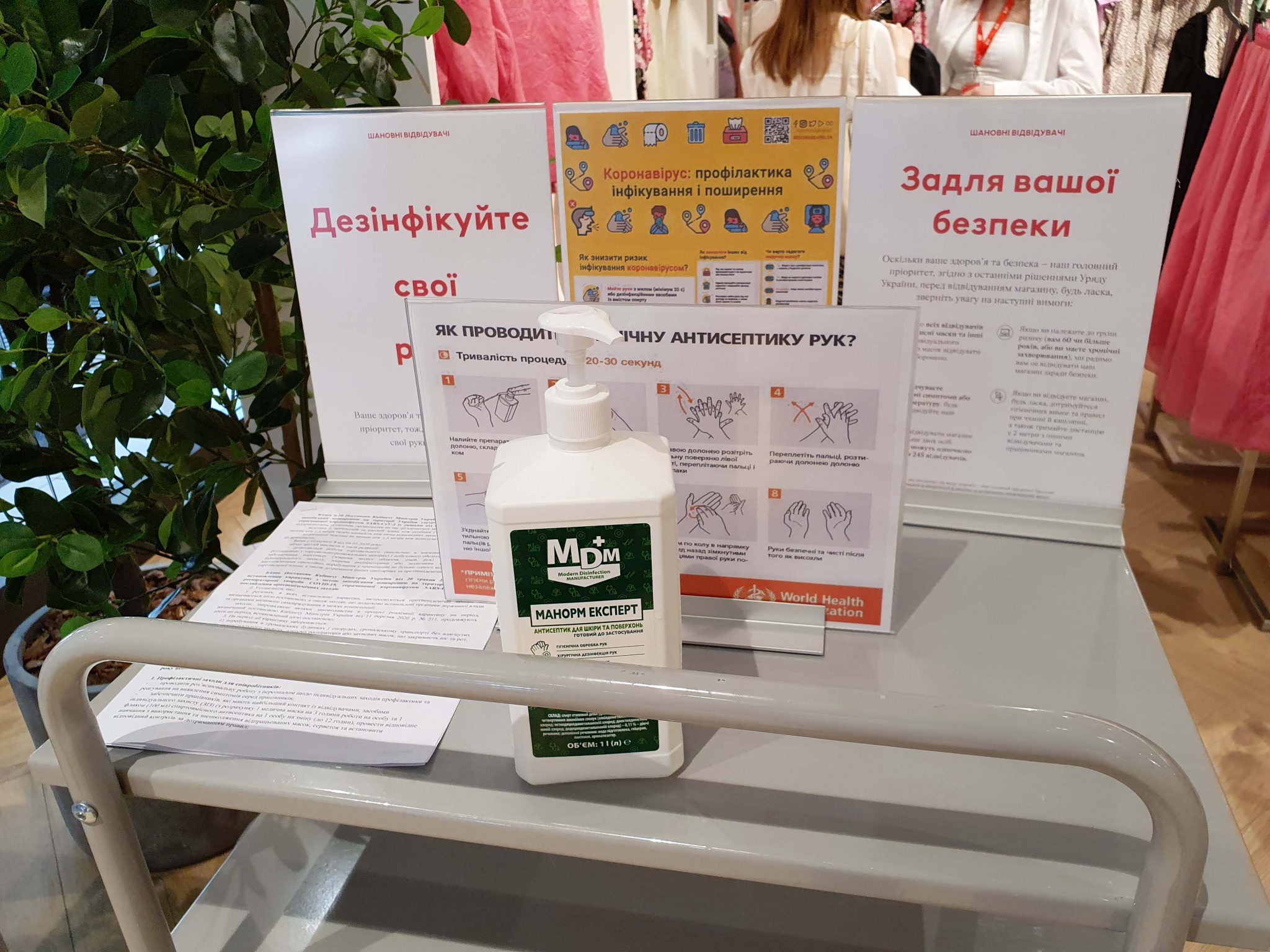 Всім покупцям на вході вимірюється температура. Співробітники працюють в масках і рукавичках, всюди можна знайти дезінфектори і стікери із закликом дотримуватися дистанції. “Спочатку, коли ми розробляли на карантині нові принципи роботи майбутнього магазину, думали, що не будемо дозволяти примірку. Але пізніше переконалися, що можливість дотримуватися дистанції є. Крім того, кожні дві години всі речі з примірочних відправляються на відпарювання для додаткової дезінфекції”, – розповідають в компанії.