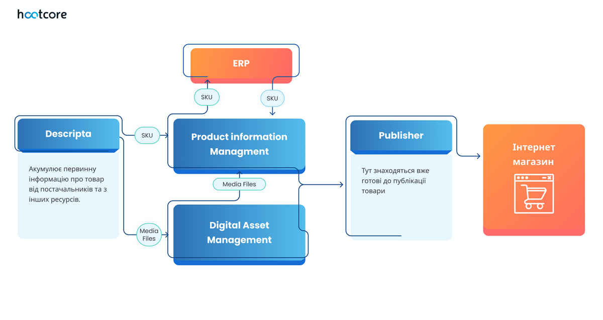 HootCore — компонується з модулів PIM, OMS, CMS та DAM і призначений для середніх та великих ритейлерів, маркетплейсів і D2C-брендів, які пропонують від 5000 і більше SKU і продають багатоканально.