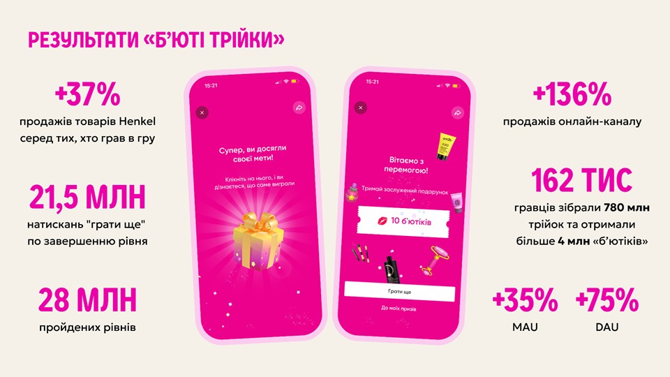 Після кожної сесії користувачі можуть натиснути на кнопку «Грати ще», і у нас таких натискань 21,5 мільйона за менше ніж за пів року, 28 мільйонів рівнів пройшли наші користувачі, що дало 136% продажів онлайні. Звичайно, це не тільки через гру, а й інші активності, які робить Prostor. Звісно, через гру користувачі частіше заходять в застосунок.