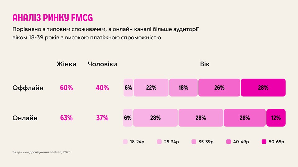 Перед тим як планували перезапуск програми лояльності, ми провели дослідження. На слайді видно, що в онлайн клієнт інший: має більшу платіжну спроможність та інший патерн поведінки.