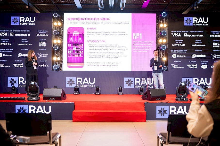 Першим в рамках цієї сесії виступили Єгор Павленко, CEO Live Animations та Наталя Середня, директорка з маркетингу Prostor. Експерти розповіли, як гейміфікація мотивує та перетворює користувача на лояльного клієнта та як ігри створюють довгострокову прив’язаність до бренду через позитивний досвід і регулярну взаємодію.