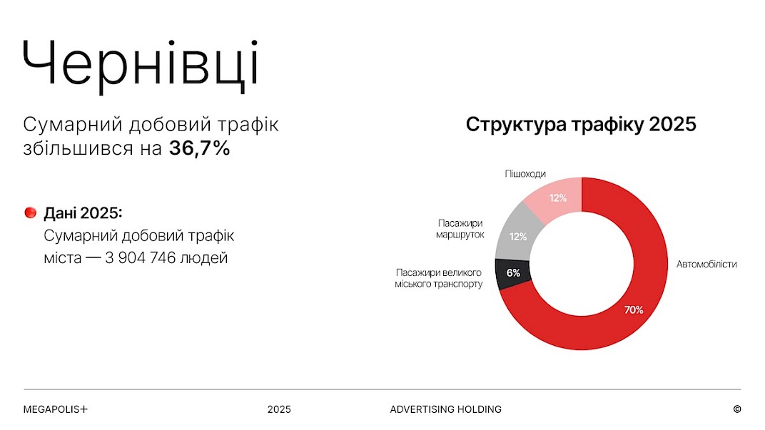 Найбільший приріст зафіксували у середніх містах на заході України. У Хмельницькому добовий трафік зріс на 72% порівняно з довоєнним періодом. Кількість контактів із зовнішньою рекламою досягла 5,5 млн. Основна аудиторія – водії (56%), наступні – пішоходи (16%), після них пасажири маршруток (15%), останні – користувачі великого громадського транспорту (11%).