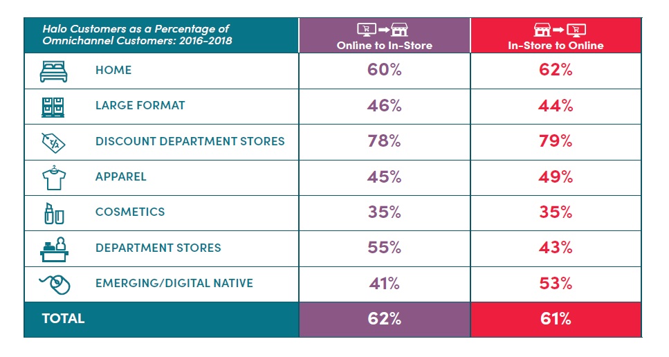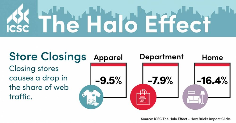У 2018 році ICSC опублікував знакове дослідження, присвячене впливу фізичних магазинів на інтернет-трафік рітейлерів. Виявилося, що присутність фізичних магазинів в рази збільшує частку інтернет-трафіку. І навпаки – закриття магазинів викликає падіння трафіку. Це дослідження в ICSC назвали «ефект ореолу» (halo effect).