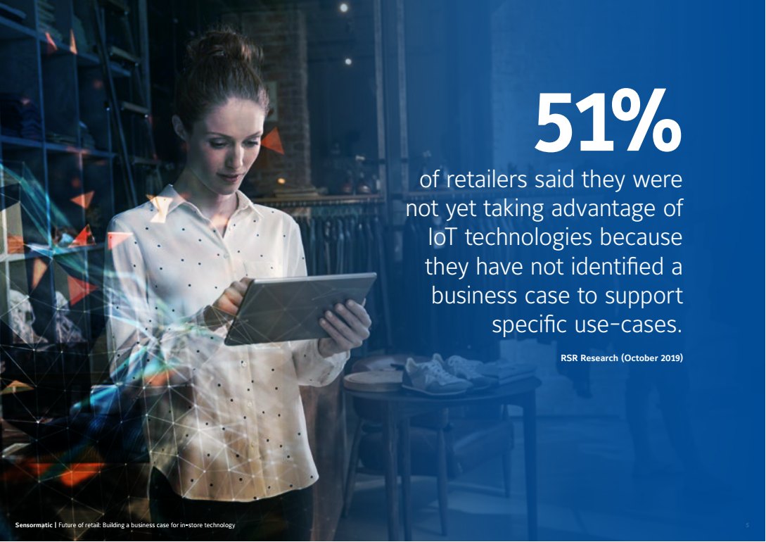 Згідно з даними RSR Research (жовтень 2019 року) 51% роздрібних компаній заявили, що вони ще не використали переваги технологій IoT, тому що не визначили бізнес-обгрунтування для підтримки конкретних варіантів використання.